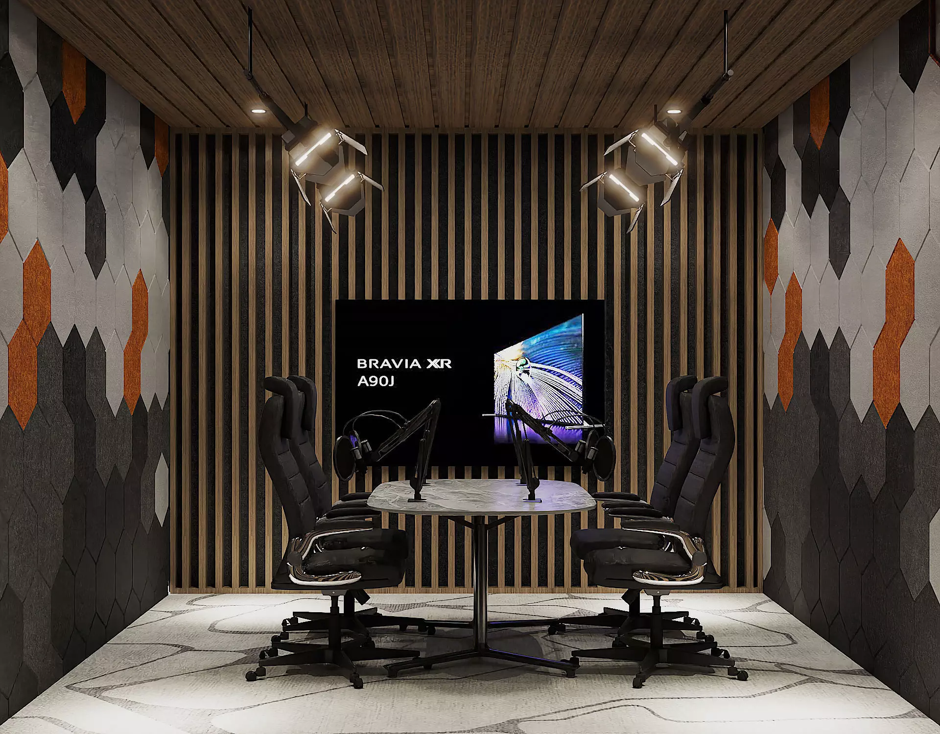 This modern podcast room interior combines a clean minimalist design with warm medium-tone wood finishes and vibrant colorful accents, creating a stylish yet functional space tailored for creative content production. The 3D model features simple, ergonomic furniture and sound-optimized design elements, balanced with pops of color that add energy and personality without overwhelming the calm aesthetic.A sleek and functional studio space designed with minimalist principles—featuring simple furniture, neutral tones, and optimized layout for versatile use.bright and airy studio design focused on simplicity and efficiency, perfect for architectural visualization and interior design projects.Elegant and practical studio interior showcasing minimalist aesthetics and thoughtful use of space—great for presentations and visual storytelling.