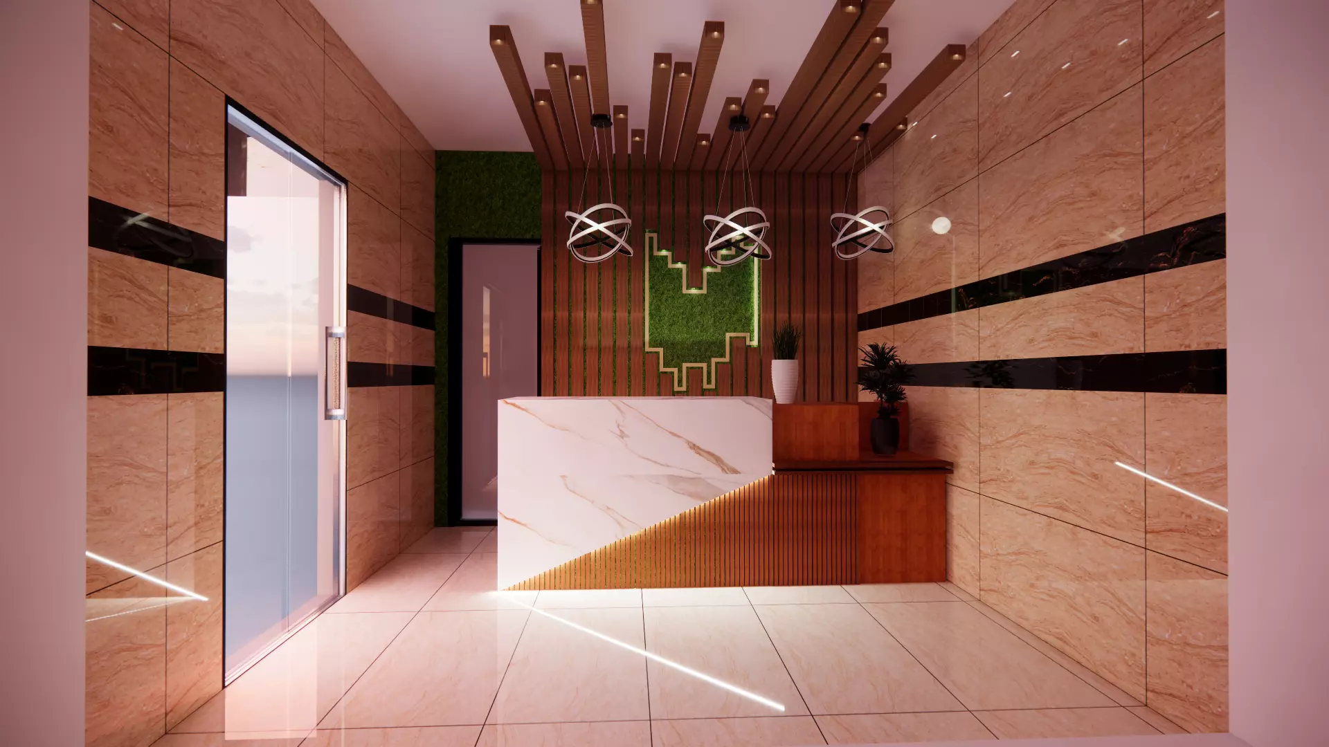 3D RENDERED DESIGN OF RECEPTION DESK OF OFFICE