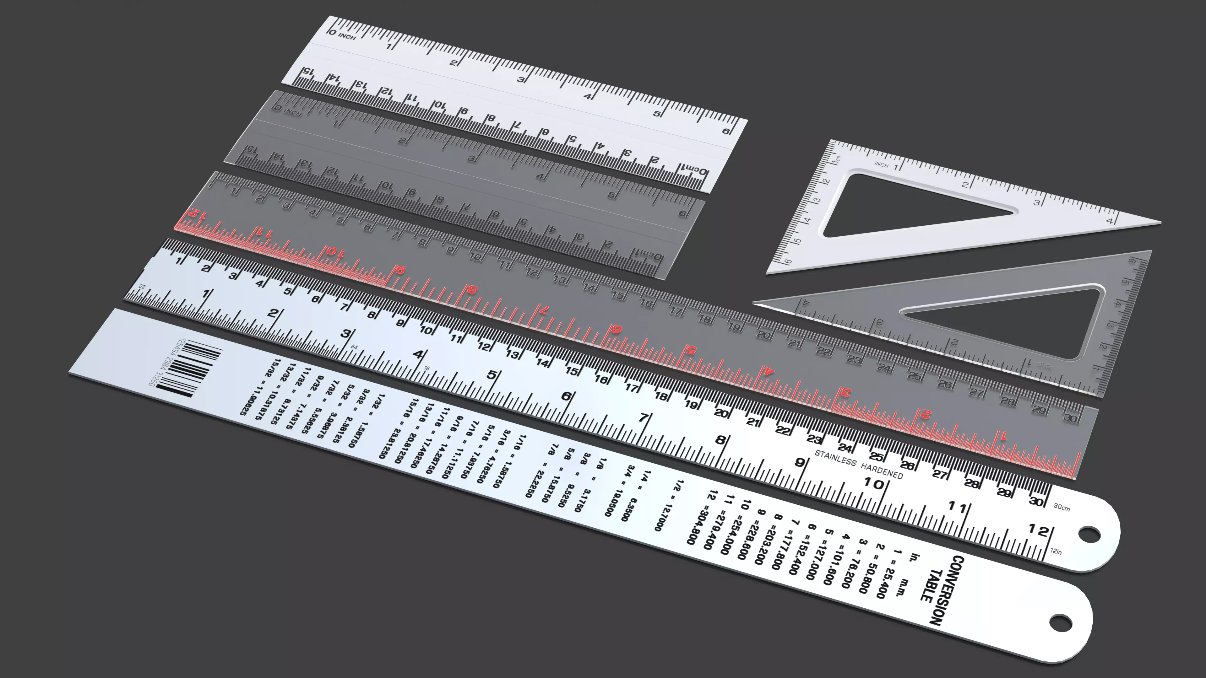 Each ruler is modeled with clean lines and accurately placed markings, capturing the real-world characteristics of plastic, stainless, and matte surface materials.