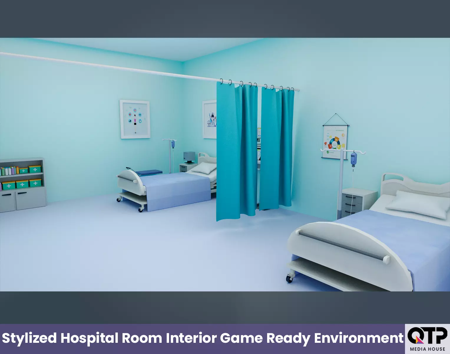 This Stylized Hospital Room Environment 3D Model is a game-ready interior scene designed for medical simulations, educational animations, stylized games, and cinematic environments. The scene includes hospital beds, medical curtains, IV stands, storage cabinets, medical supplies, and decorative wall posters, creating a clean and organized healthcare environment.