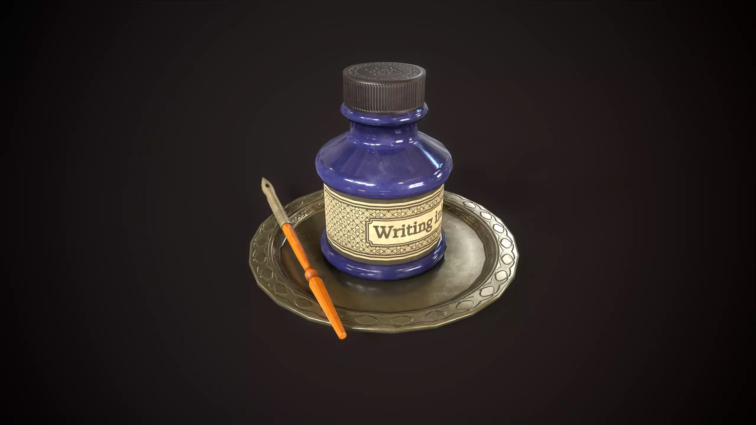 Two 3D models, ink pot and ink pen. Made in Victorian style.