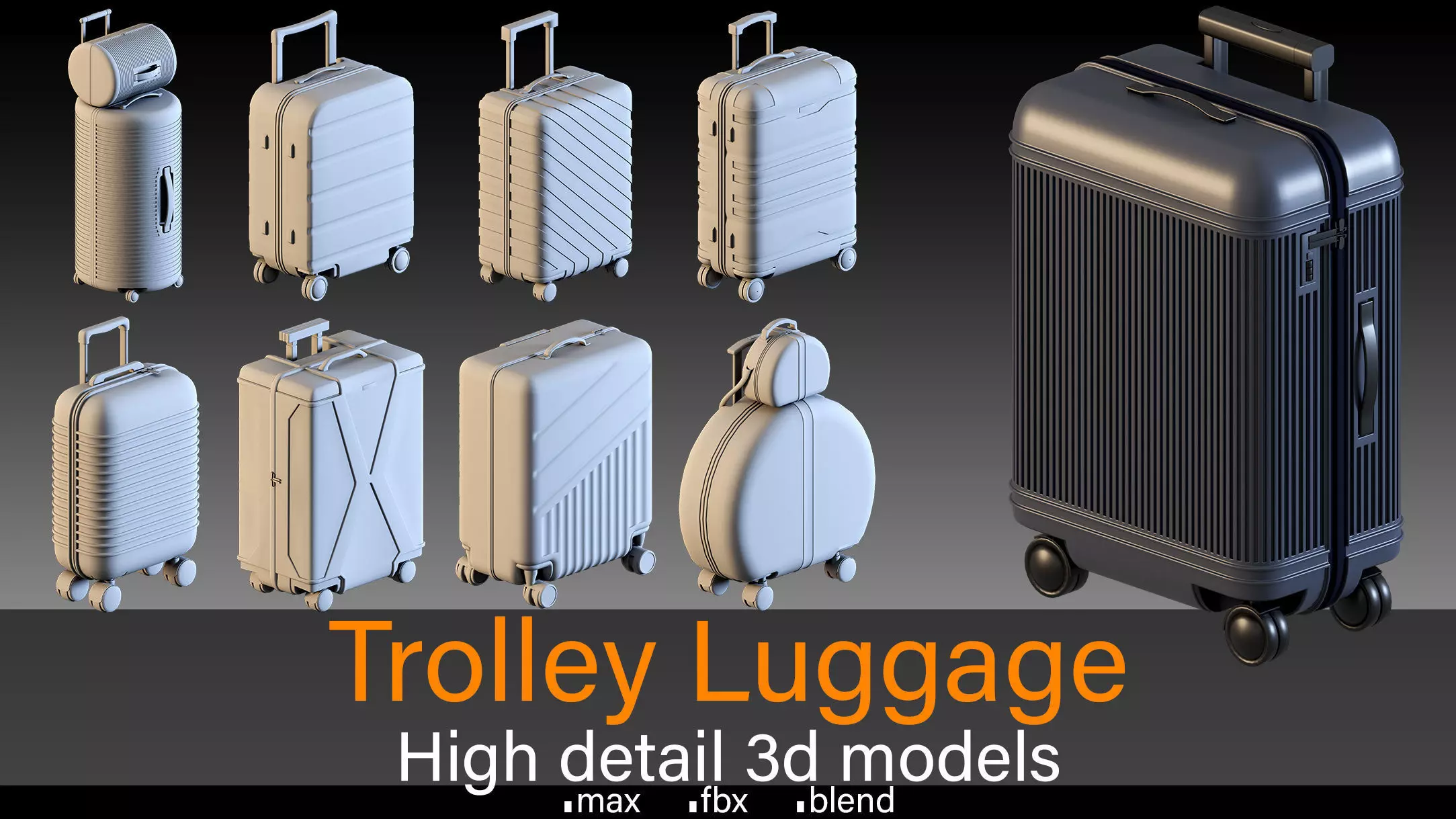 20 Unique Trolley Luggage Designs: Each model is distinct, offering a wide range of shapes and styles to ensure maximum visual variation and non-repetition in your scenes. * High-Detail Modeling: Models are designed with high geometric detail, making them ideal for high-resolution rendering and close-up views. * Clean & Versatile Geometry: Models feature clean topology and are ready for use as detailed static props or modeling reference assets. * Excellent for Scene Assembly: Use these unique pieces to quickly populate environments like airport terminals, train stations, or hotel lobbies.