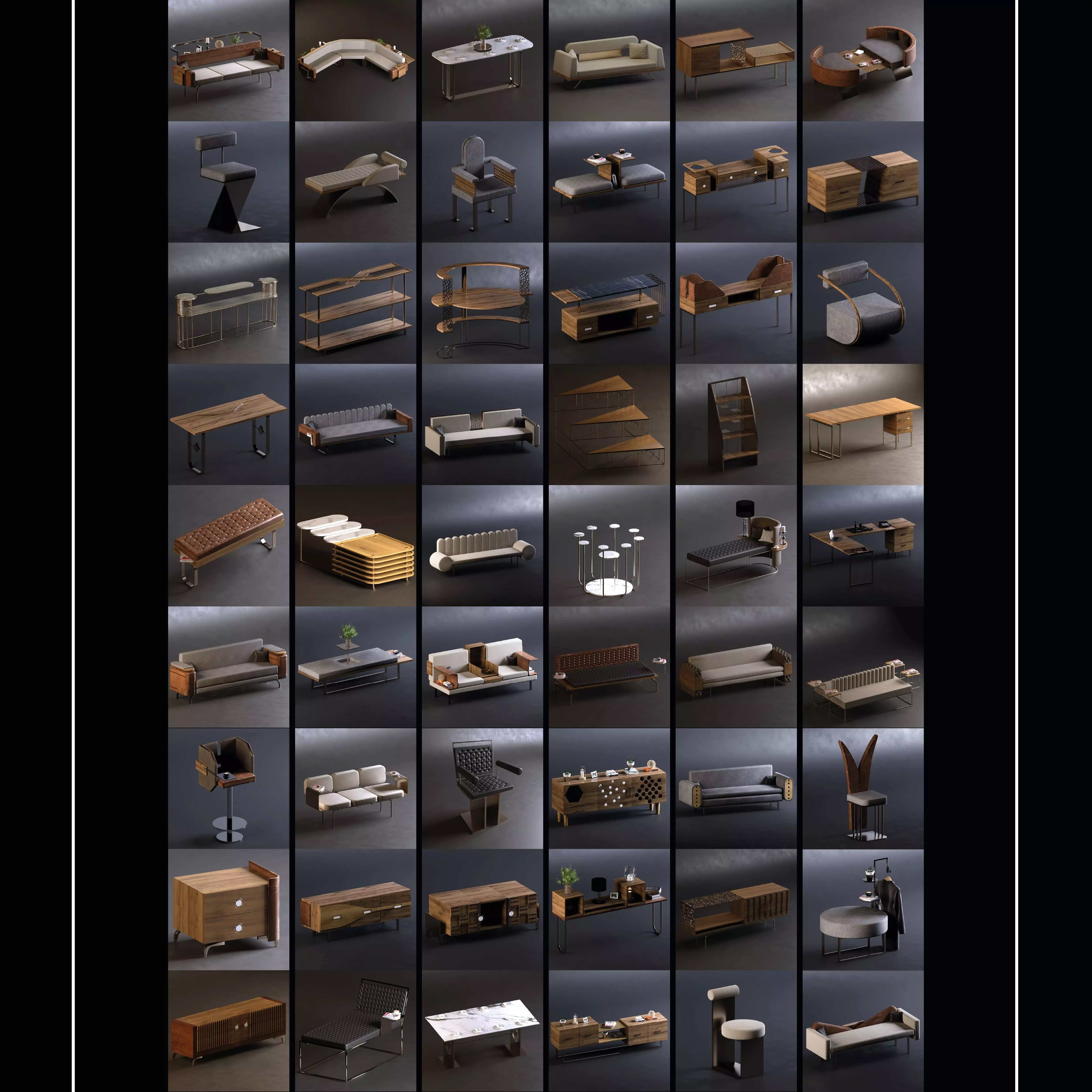 Furniture designs were designed with 3DS Max. Many pieces of furniture do not have the textures seen in the image. Some of them were selected from Corona material and placed on the object. Some textures were found on the internet.