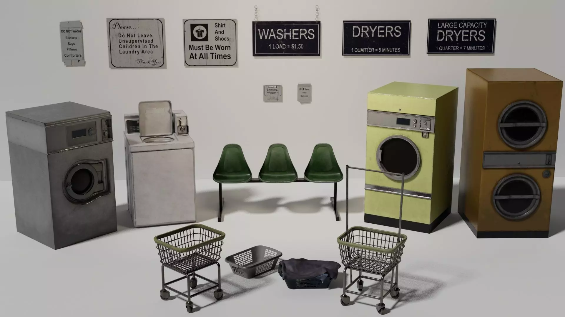 This pack includes a focused collection of high-quality, game-ready laundromat machines and accessories, created for real-time use in Unreal Engine, Unity, and other modern engines. Perfect for any worflow, especially with Nanite and vertex painting. High poly models that can easily be cleaned and converted to low poly.