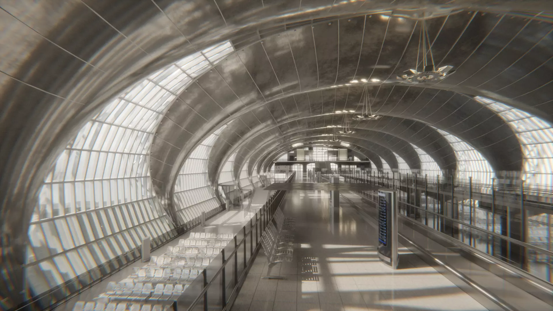 Airport waiting hall, metallic texture, glass curtain wall, escalator, second-floor passageway, modern minimalist style, industrial design, PBR material, high-precision 3D scene, architectural visualization model details of the terminal building:Metal main frame: Made of high-reflective stainless steel and decorated with anodized aluminum finish, it presents a cold and technological feel All-glass curtain wall: Transparent/frosted double-layer glass design, with adjustable refraction and transparency parametersAutomatic elevator system: