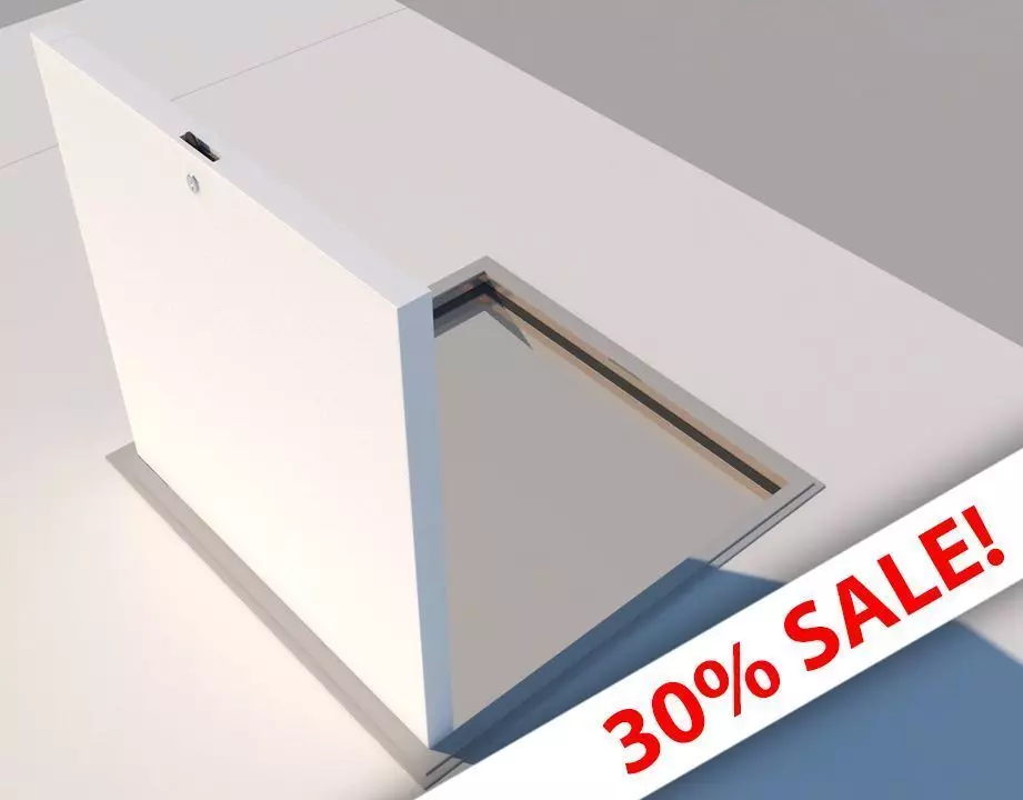 As is detailed in this model, access panels or loft hatches are commonly manufactured with an all-around frame, as opposed to the usual one that does not frame the bottom of the door. They usually come with lock and cylinder that allow to lock the door properly with a key, like this model, but they can also be manufactured with a triangle locking system to make the access easier; a pole with a triangluar head could then be used to to open the hatch latch from ground level, without the need to stand on steps to reach the loft hatch door. The latch and the latch bore or mortise (hole recess) into the frame are all featured on this model.