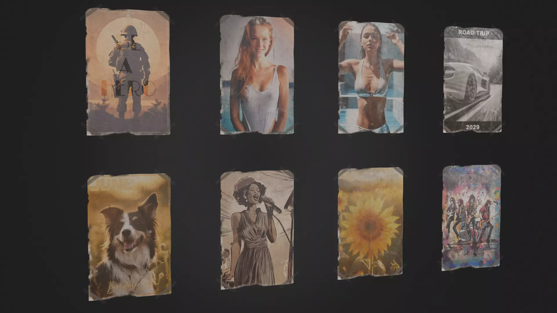 /Highly detailed 3D model of 8 texture variations of posters, perfect for digital art presentations, architectural visualizations, and interior design projects. /Formats included: Blend, FBX, OBJ; scenes: BLEND (4.1 with Cycles / Cycle material); other: png with Alpha.