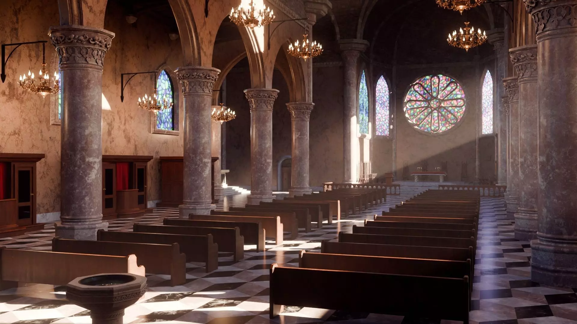 This environment recreates a classic European-style cathedral interior featuring grand stone columns, arched vaults, detailed chandeliers, wooden pews, confessionals, marble floor tiling, and stained-glass windows with dynamic light interaction. The scene is carefully composed to achieve a dramatic and atmospheric lighting setup, ideal for high-end renders.