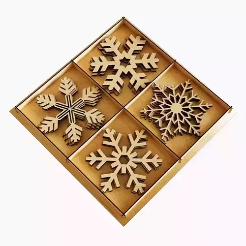 Set of 3D models of snowflake Christmas tree decorations in a plywood box.