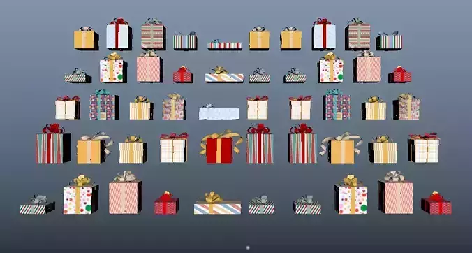 Bring the magic of Christmas into your scene with this Christmas Gift Box Mega Pack, featuring 60+ unique holiday present boxes in classic Christmas colors, festive patterns, gold ribbons, candy-stripe textures, and winter-themed designs.Every model is clean, optimized, and perfect for Christmas renders, Santa scenes, winter decorations, animations, games, holiday marketing visuals, festive showcases, and product environments.