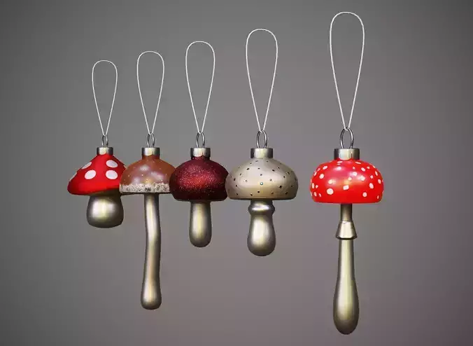 The scene has five objects (five Christmas tree toys - mushrooms). All of them have one common material and one UV map.