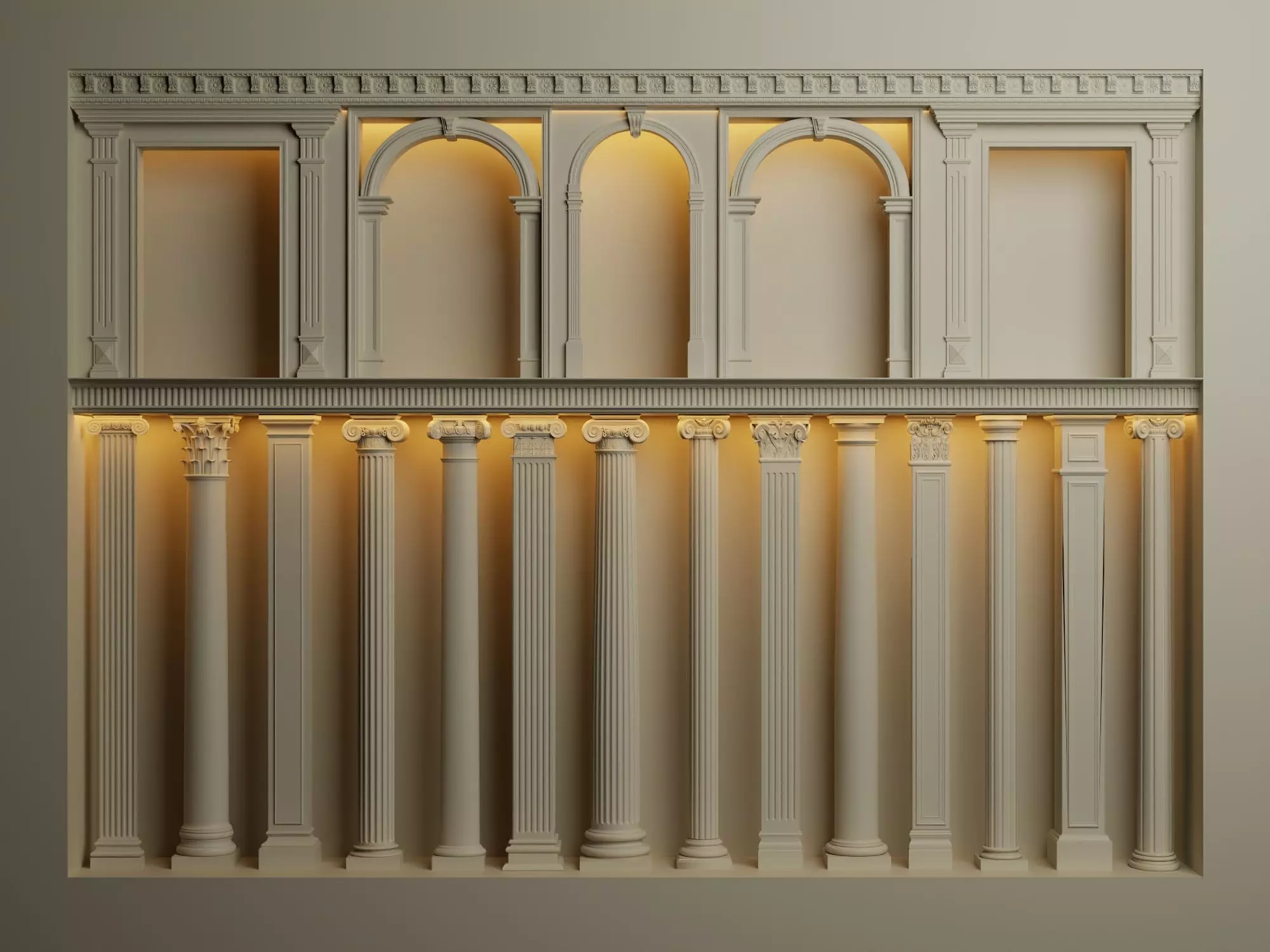 High-quality classical architectural elements 3D model pack, featuring columns, arches, cornices, wall niches, and decorative moldings.