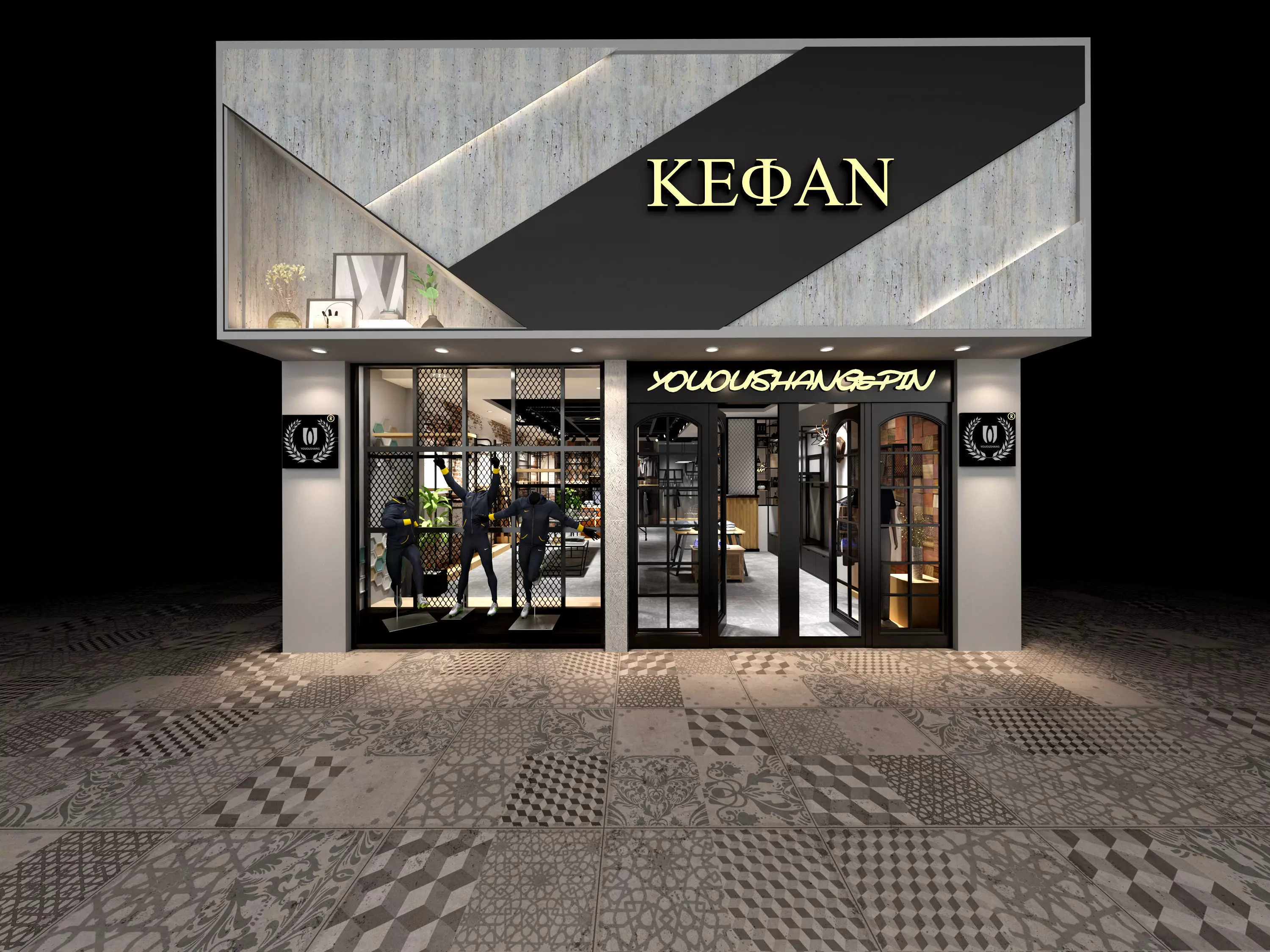 These are the design renderings of KEΦAN brand men's clothing store, including the exterior and interior spaces.