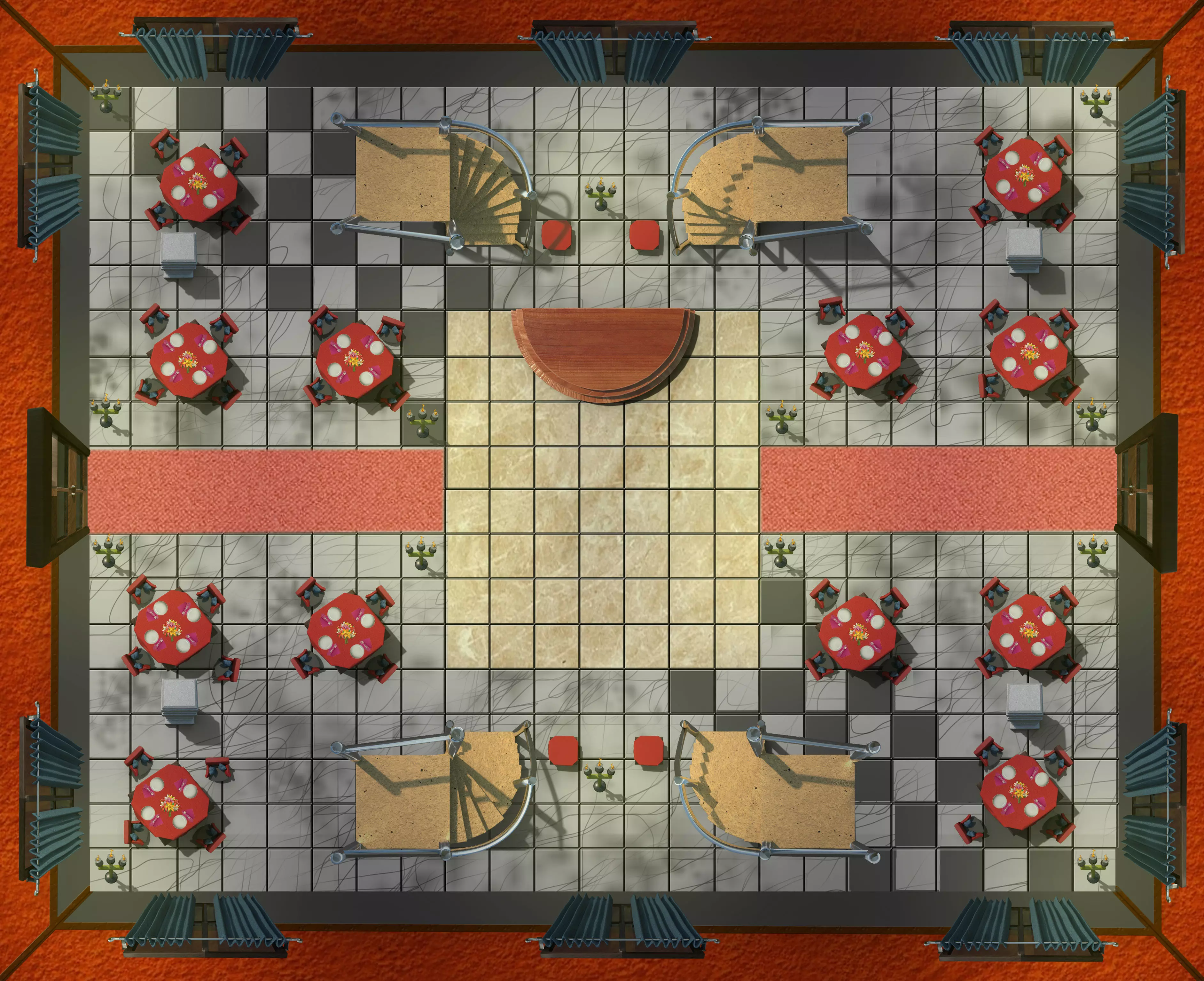 Ballroom pictures of the maps are not included but examples on how these items could be used in a top down map, or in a 3d enviroment map. Some accessories found in ballroom pictures are not included such as carpet, lightning, walls and flooring and center stage.