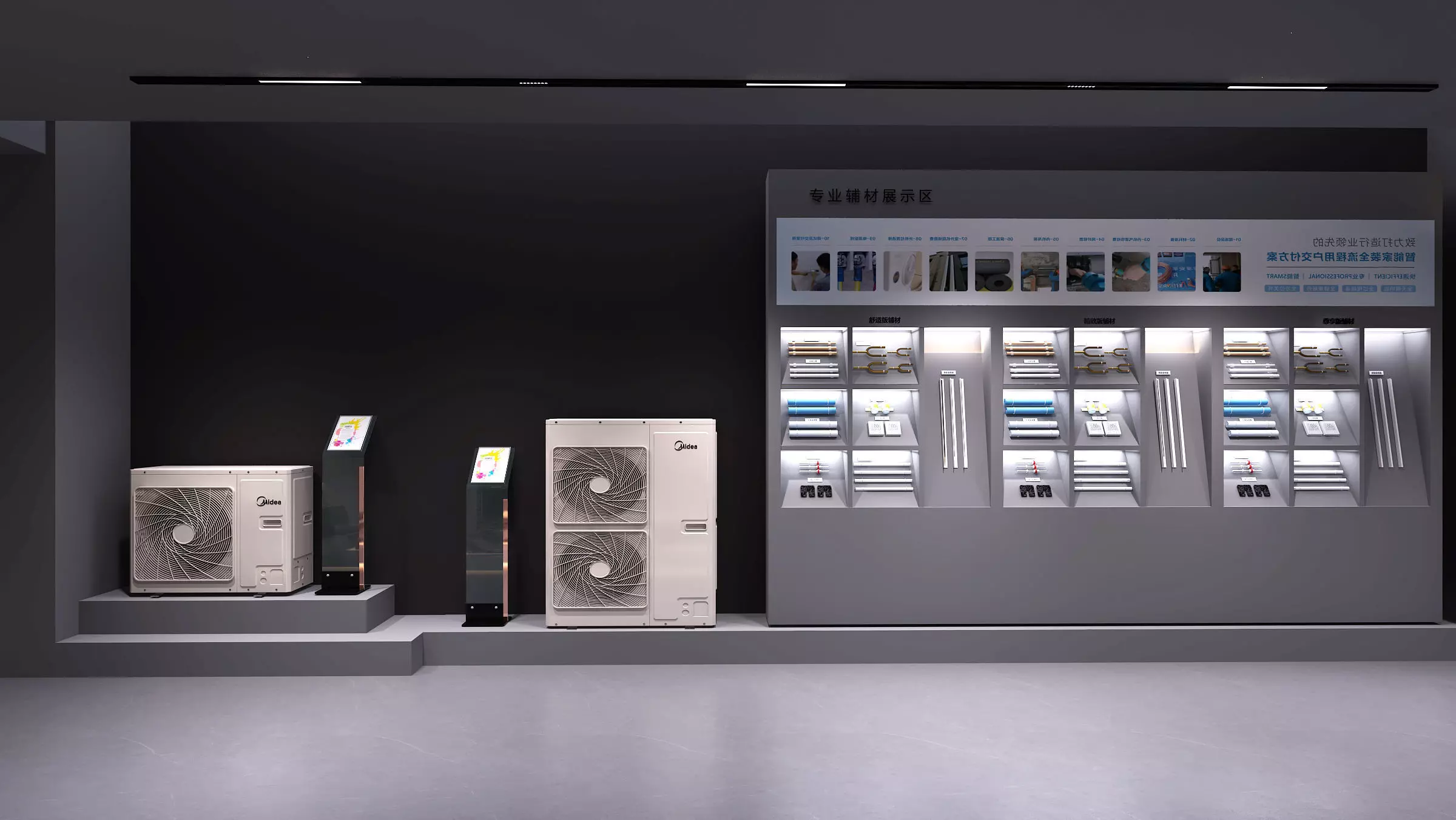 This modern, beautiful, air-conditioned corporate showroom boasts a spacious and luxurious interior, combining architectural precision with a refined material palette. This adds a sense of sophistication and visual depth.