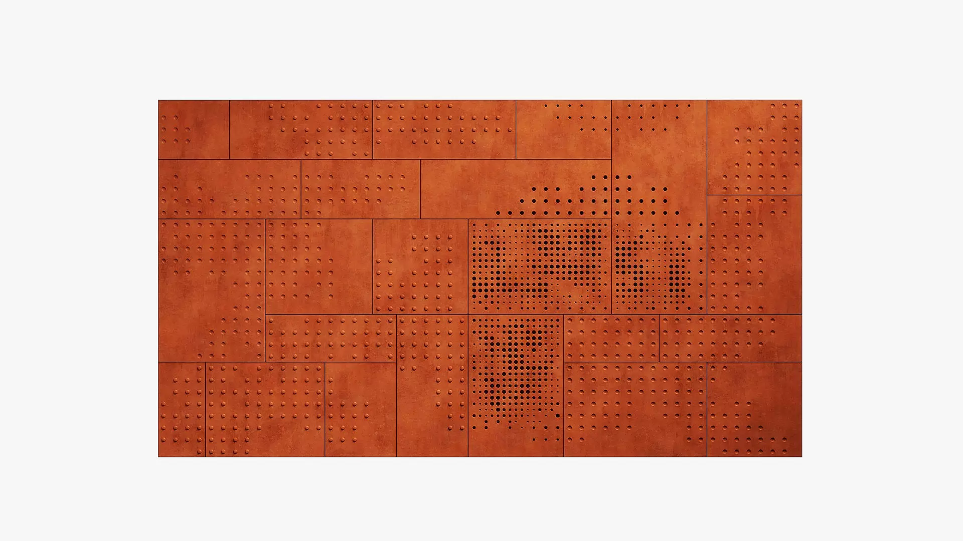 Two sets of panels made of corten steel. The first set of panels contains material with tiling textures. The second set of panels contains material with baked textures, be careful. Each composition is made up of panels with three types of surfaces: perforated, with rivets, with spherical recesses.