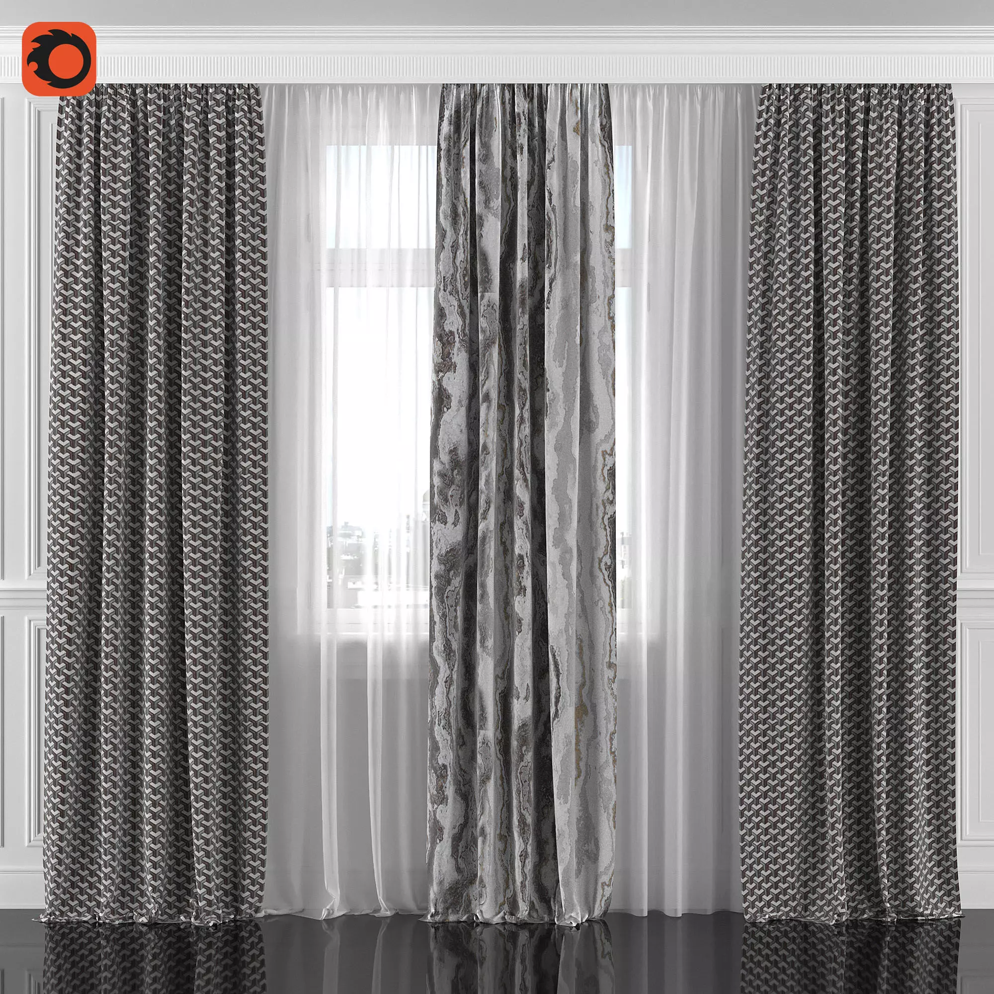 3D model of curtains and window. Curtains are suitable for any interior design of houses, apartments, bedrooms and living rooms.