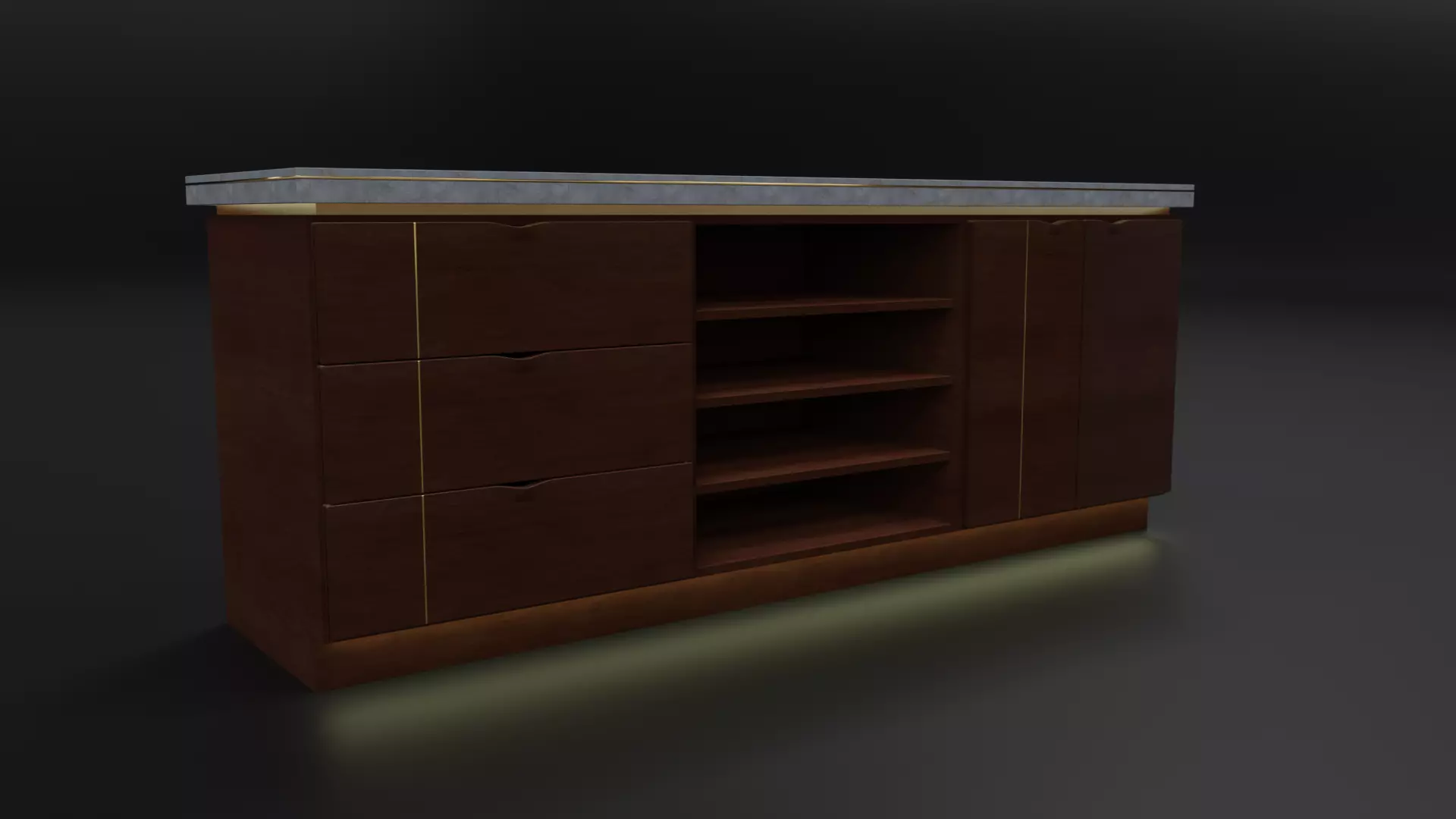 High-quality custom cabinet w/ concrete countertop and metal inlay designed & created by Seagriff Design Studio for use in architectural visualization, product rendering, and real-time applications.