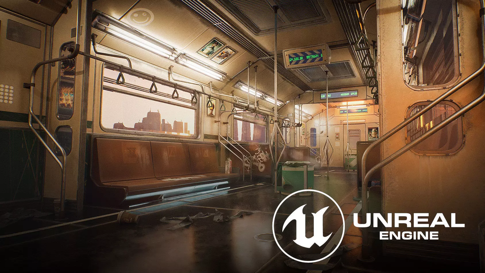 Cyberpunk Subway Environment Kit. Contains number of high quality meshes to build realistic/cyberpunk/sci-fi subway train. There are a number of modules, custom materials and decals for set dressingAlso package includes detailed demo map with train interior and moving city to showcase moving train.