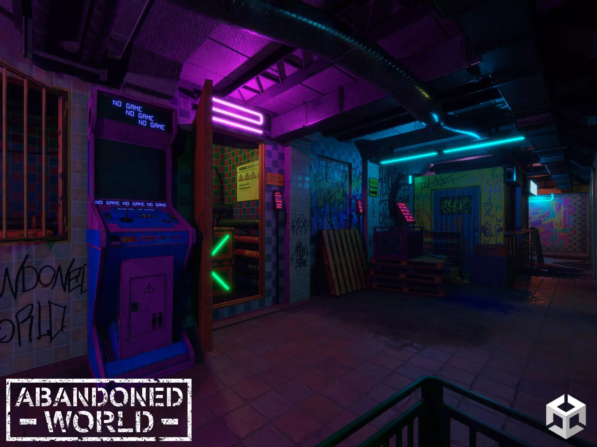 The set includes graffiti drawings, inscriptions and tags made specifically for this package. The stage is prepared with baked static lighting. Also in the package there are elements of ventilation and pipes, garbage, boxes, a stall, monitors, technical equipment and other.