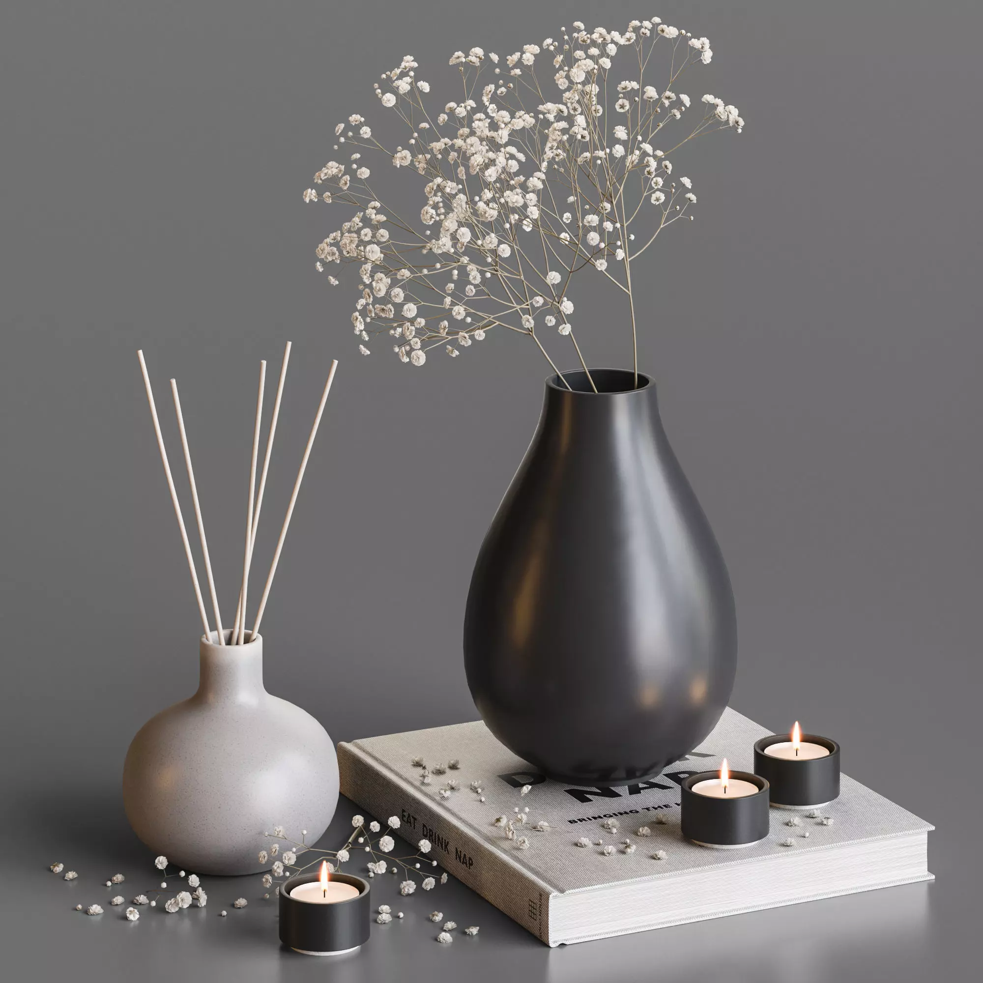 Decorative set with dry gypsophila branches.
