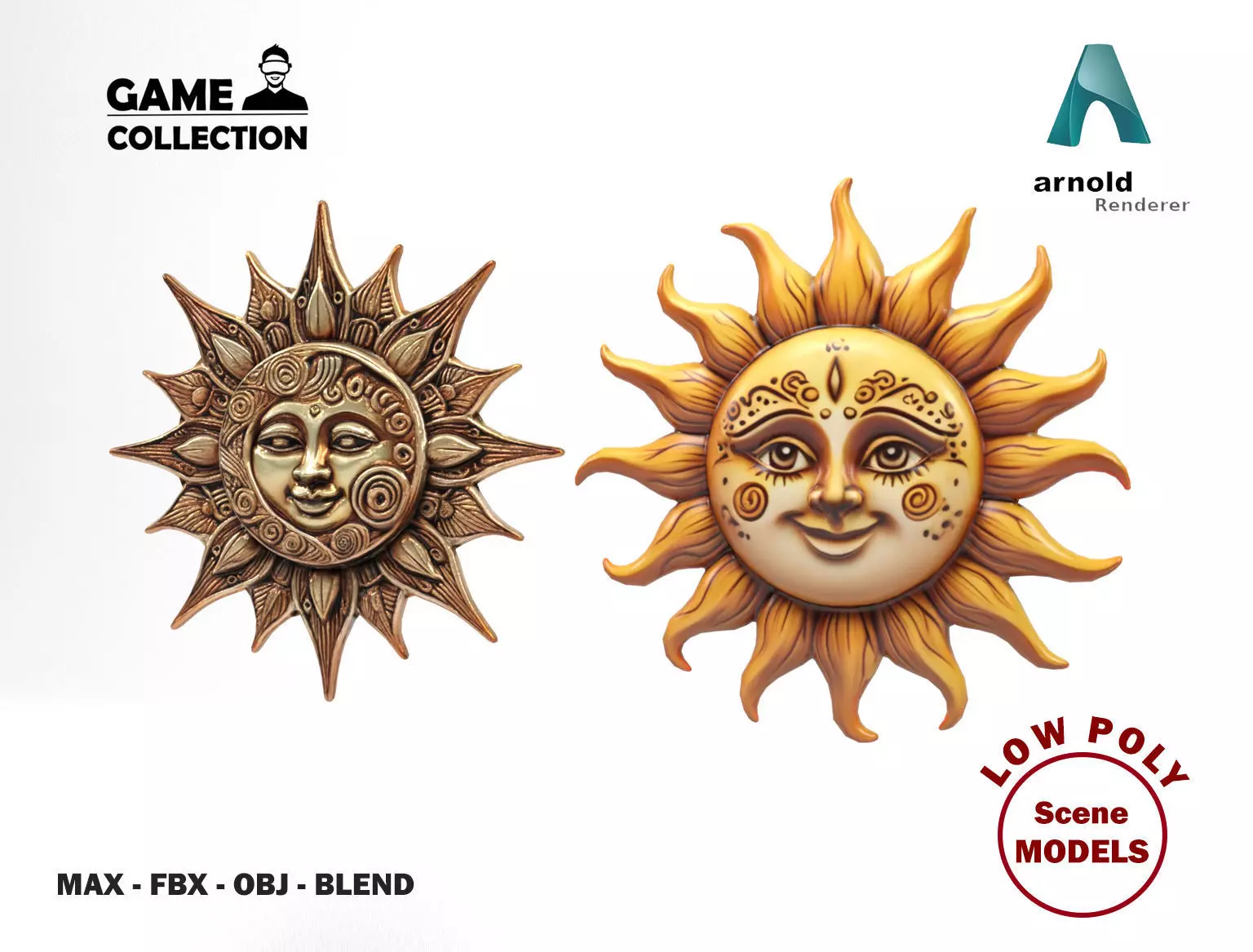 3D models of Decorative suns for wall . All the models are low poly, basic but realistic and are ideal for 3D scenes that require few polygons. They can be used for advertising visualitations and also for games or applications. It has been created in different 3D Studio Max versions and also in FBX, OBJ, STL and blend.