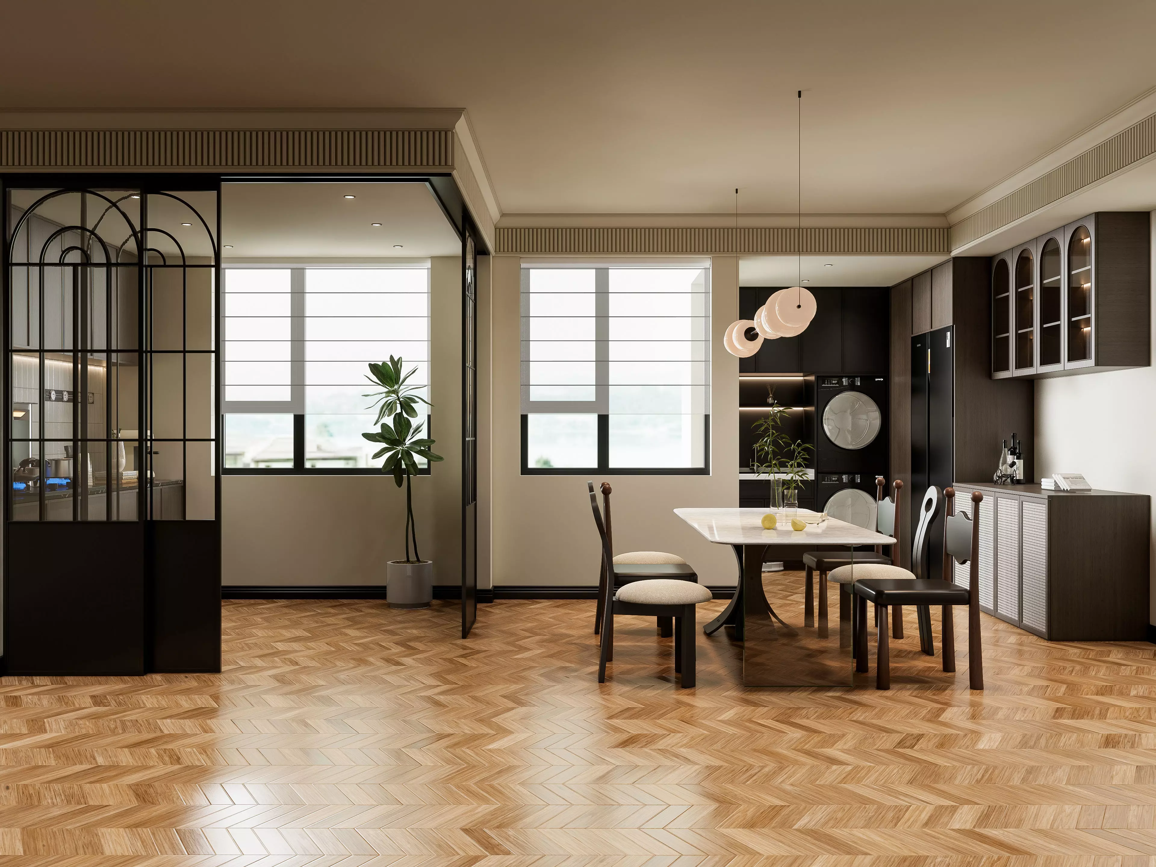 The 3D model includes a beautifully designed dining table set with chairs, elegant lighting fixtures, stylish decor elements, and realistic textures that add depth and authenticity to your scenes. Whether you're an architect, interior designer, or a 3D artist working on architectural visualization, this model provides you with a versatile and ready-to-use asset.