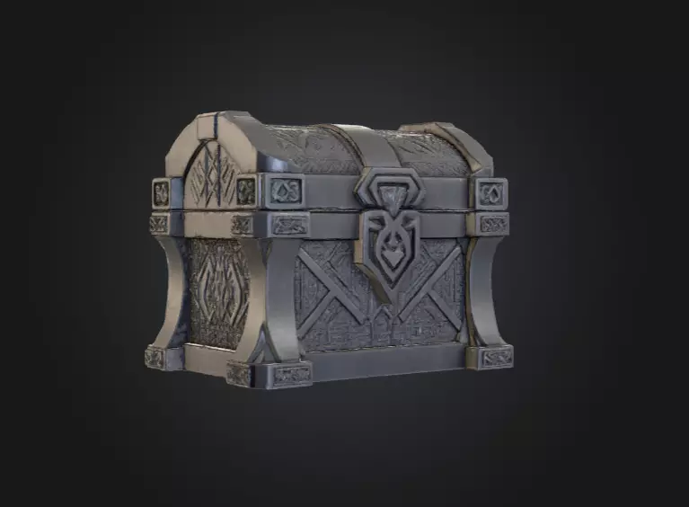 The model showcases a heavy iron frame, reinforced with symmetrical bands and intricate knotwork motifs inspired by ancient dwarven culture. Its arched lid and angular supports hint at centuries-old construction methods meant to endure both time and battle. Every carved detail tells a story — of treasures once kept safe, of runes that may conceal enchantments, and of the pride of the forge that birthed it.