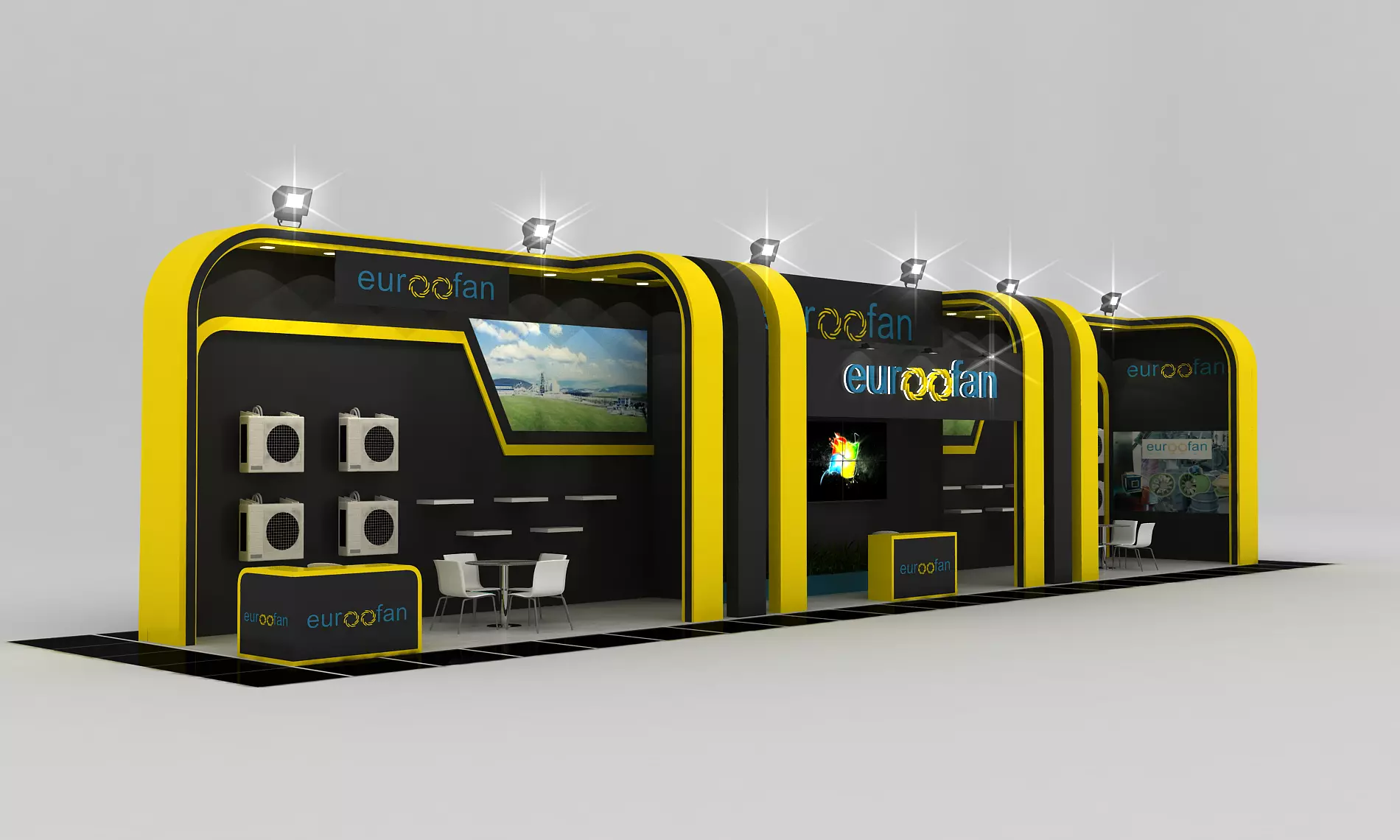 Stall Size 20 m x 3 m Height 350 cm - 2 Side open- Discussion room - Store- Reception table- TV