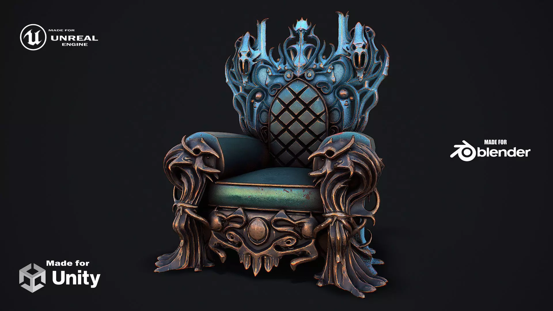 Hello. This is a high definition quality polygon of a Fantasy Throne 4 3D Model with PBR textures. Extremely detailed and realistic. Suitable for movie prop, architectural visualizations, advertising renders, games, VR, AR and other. The archive includes Obj and FBX, Marmoset scene, Blender scene, textures for the PBR: Base color, Metallic, Mixed AO, Normal_OpenGL, Roughness. And also included in the archive textures for UE: BaseColor, Normal, OcclusionRoughnessMetallic. All textures are 4k resolution. The model contains 1 object: Fantasy_Throne_4.