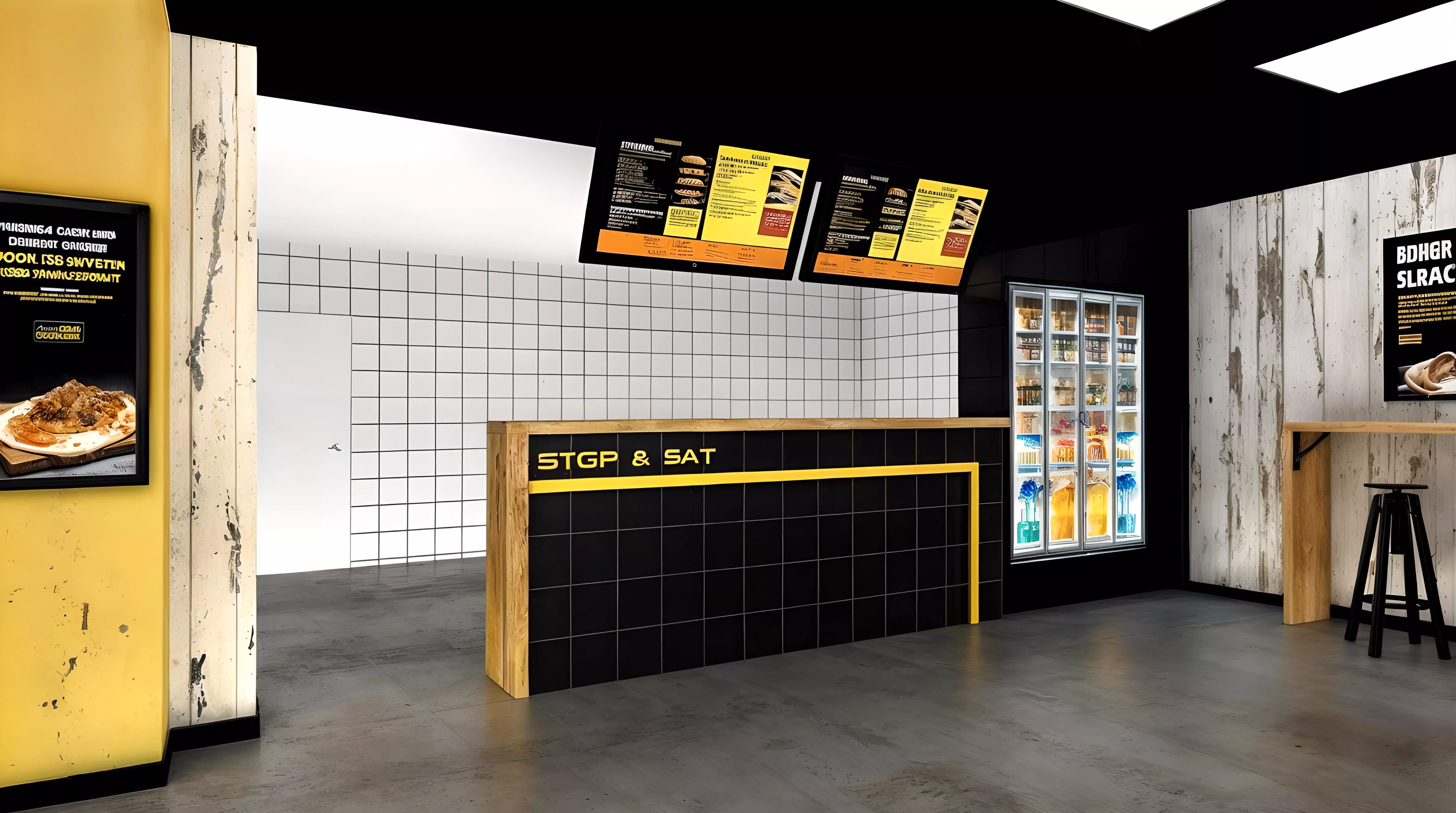 The ordering counter is straightforward and functional, with digital menu boards for easy viewing. Behind the counter, the kitchen is partially visible, emphasizing transparency and cleanliness. The refrigerated display offers a variety of beverages and ready-to-go items, catering to the fast-paced nature of a modern fast food restaurant.