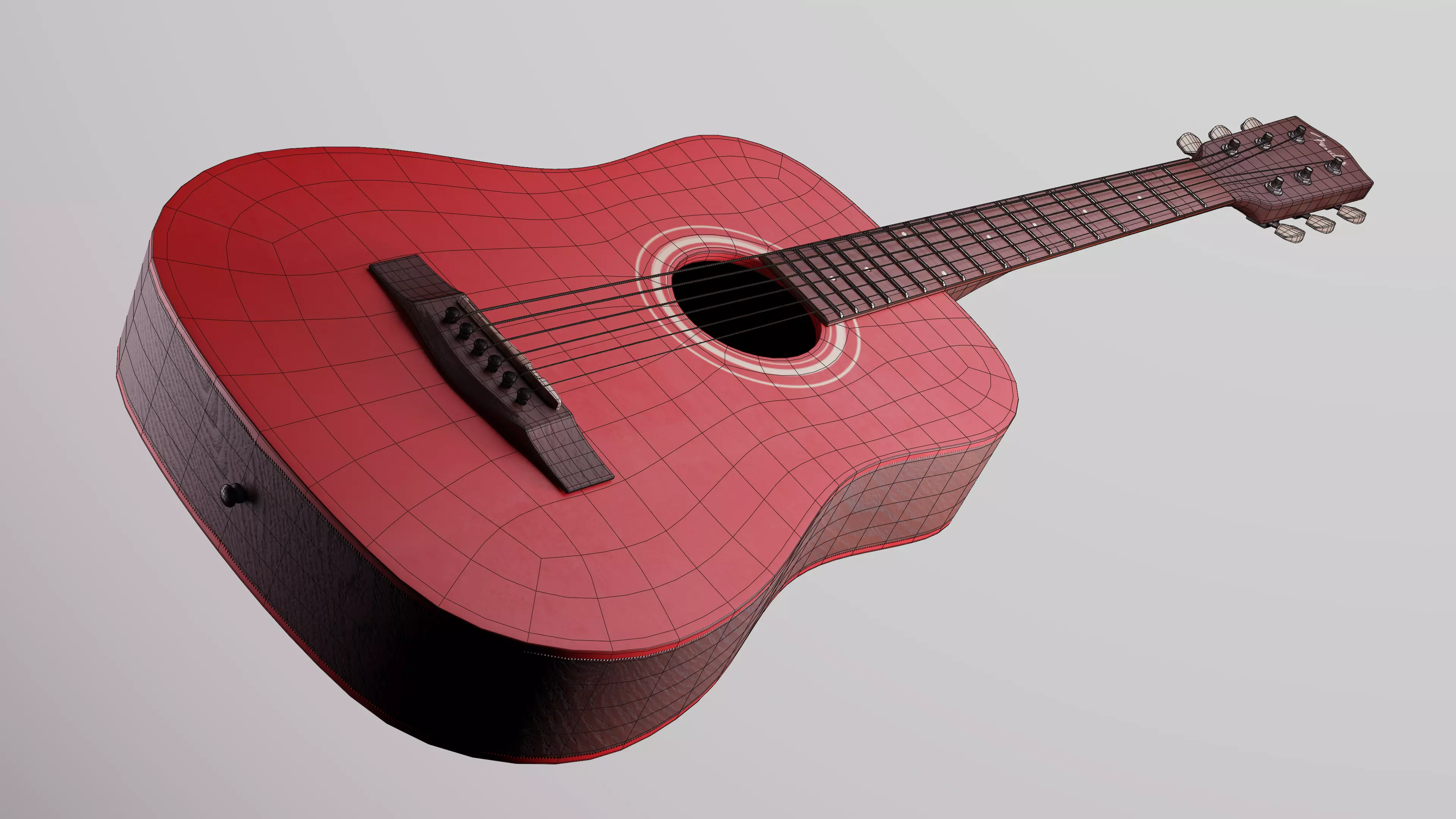 A 3D model of an acoustic guitar, modelled in Blender and textured with Adobe Substance Painter.