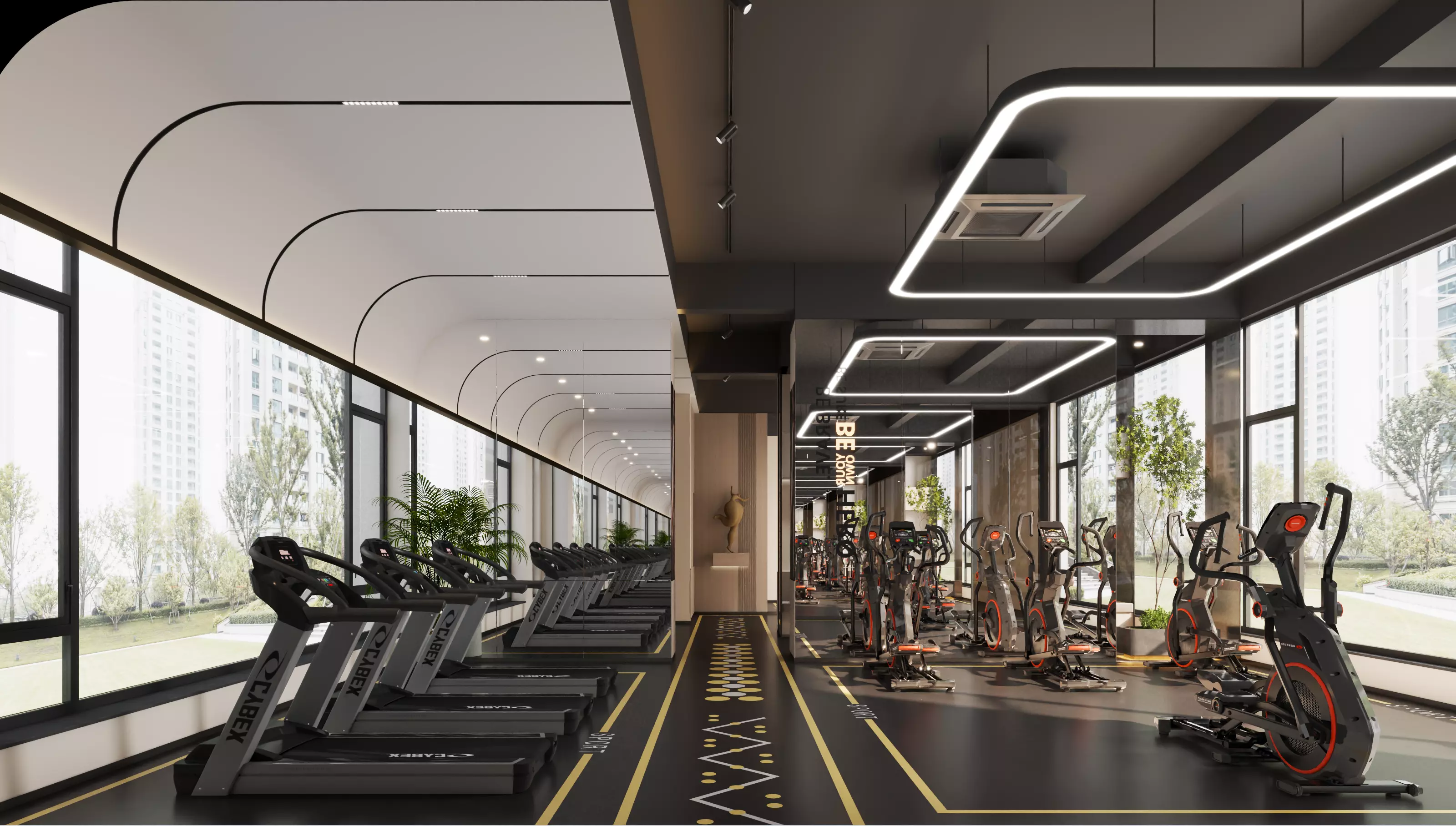 Premium Modern Minimalist Gym Interior SceneThis is a high-quality, professional 3D scene of a modern minimalist gym, featuring a clean aesthetic with a signature curved linear lighting design and floor-to-ceiling panoramic windows. Perfect for high-end architectural visualization and interior design presentations.Key Features:Complete Equipment: Includes detailed treadmill (cardio) and stationary bike (cycling) units with realistic textures.Professional Lighting: Pre-configured V-Ray lighting setup with ambient daylight and designer curved LED strips.Clean Geometry: Modeled in 3ds Max with clean topology, optimized for high-resolution close-up shots.Multiple Formats: Native .max file provided, plus .fbx and .obj exports for easy integration into other software.Technical Specs:Primary Software: 3ds MaxRenderer: V-RayFormats: .MAX (Native), .FBX, .OBJUnits: MillimetersTextures: All high-resolution textures and PBR materials included.