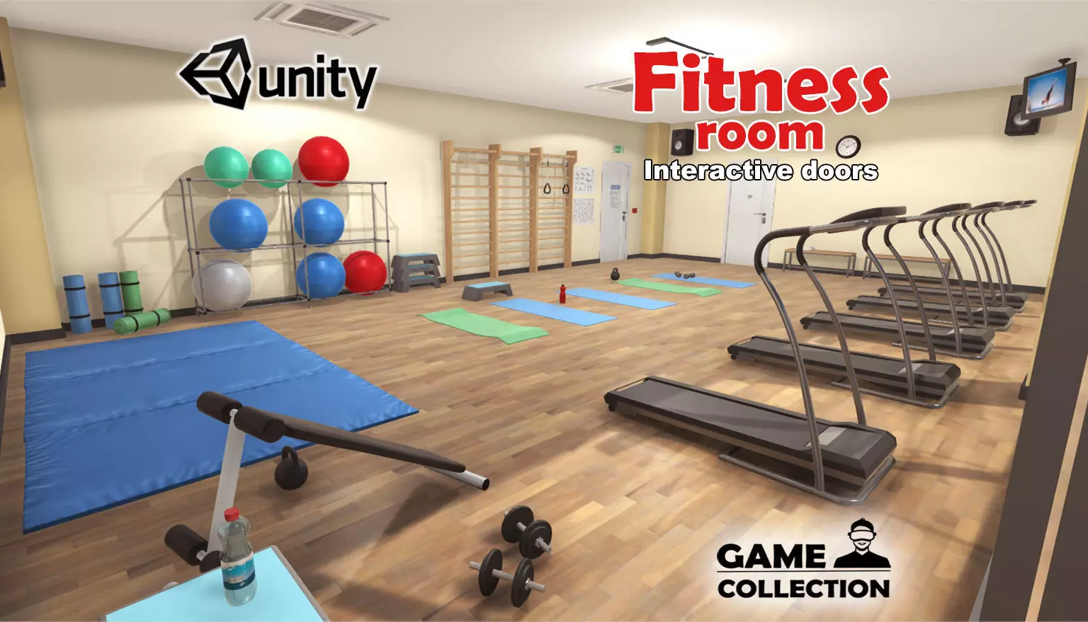 Interior of a fitness room of a gym originally created for Unity. It has a total of 41 models. The models could be found in a real fitness room. There are pilates balls, weights, mats, benches, some treadmills, posters, gym rings, bottles, speakers, TVs, a clock.....and more.The doors are scripted to be opened and closed when approaching with and indicative image and text to interact with the scene. All the models are low-poly to be used in games and applications. There are also the FBX models included separately, textures included, to be used in other 3D apps.Included:
