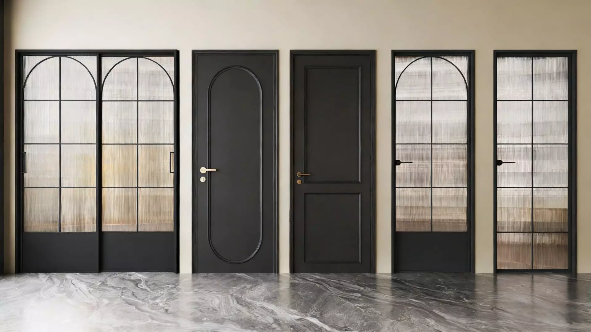 This is a collection of modern interior doors featuring a matte black base, blending multiple styles such as minimalism, French retro and light luxury. The images include double arched fluted glass doors, single elliptical flat-panel doors, classic two-tone doors, as well as semi-transparent glass doors in various proportions. The vertical texture of the fluted glass paired with black metal grid strips ensures natural light transmission while protecting privacy, and the arched and elliptical lines add a soft retro ambiance. The overall design is suitable for a variety of home decoration styles including modern minimalism, French light luxury and wabi-sabi; these doors can serve as functional doors for bedrooms and bathrooms, and also act as space dividers to enhance the overall aesthetic of the space.