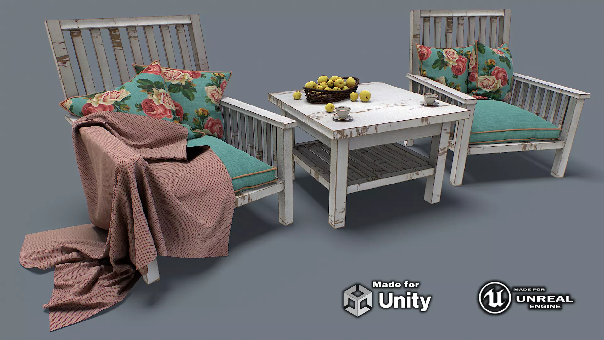 Hello. This is a high definition quality polygon of a Furniture group Provence 3d model with PBR textures. Extremely detailed and realistic. Suitable for movie prop, architectural visualizations, advertising renders, games and other. The archive includes Obj and FBX, textures for the Unity: Base color, Height, Metallic, Mixed AO, Normal_OpenGL, Roughness. And also included in the archive textures for UE: BaseColor, Normal, OcclusionRoughnessMetallic. The number of materials correspond to the number of main objects in the scene. Textures a made in 4k. The model contains 18 objects and 14 materials: apples, bascket, cup_1_2, pillow_1_2_3_4_5_6, plaid, saucer_1_2, tea_1_2, wooden_chair_1_ wooden table. If you need, we will make a file of this model for 3D printing especially for you. Original file size: 2.23 GB. Archive file size: 1.31 GB.