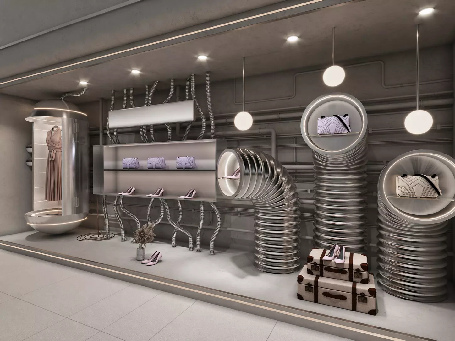 This futuristic retail display window combines industrial elements with fashion presentation, creating a unique and visually striking environment. Featuring metallic pipelines, modular display units, and illuminated product showcases, the space presents fashion items as if they are part of an advanced manufacturing system.