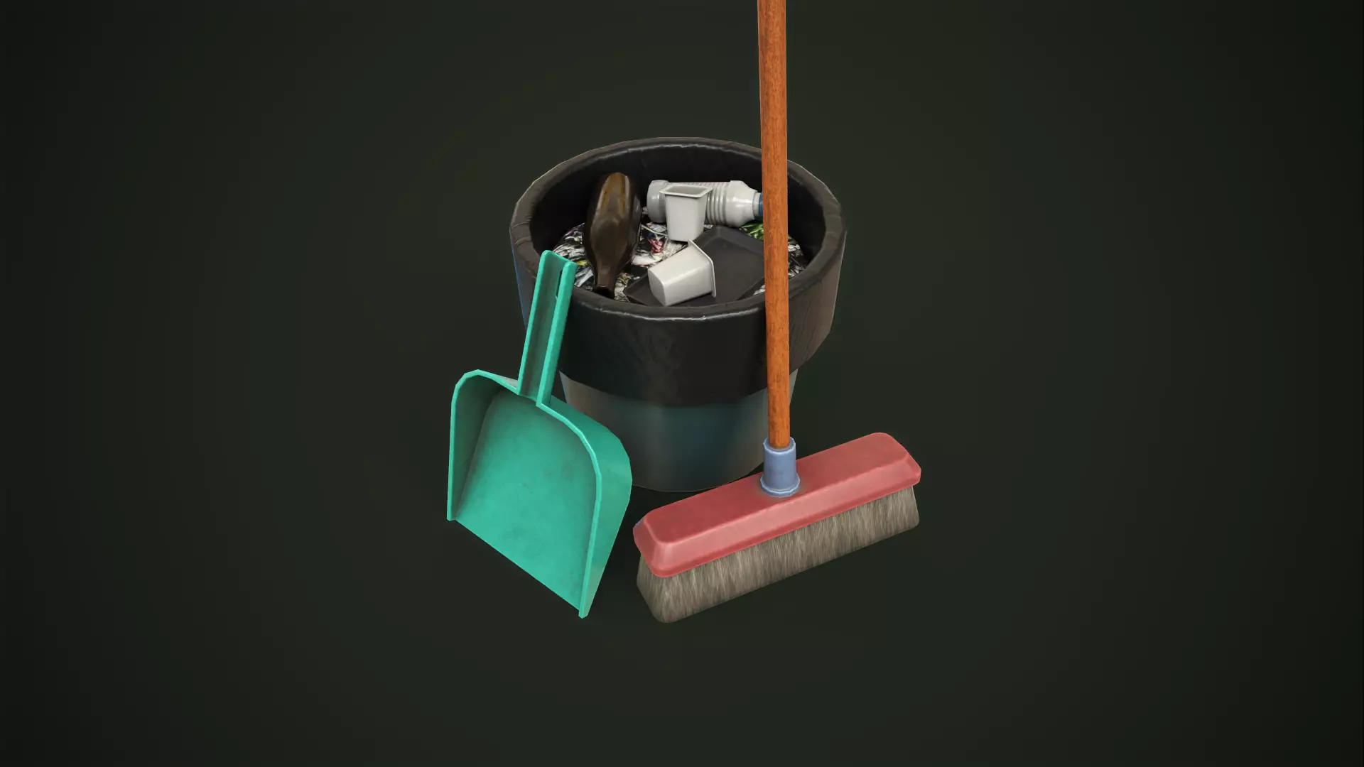 A small set of models, it includes a bucket of garbage, a broom and a dustpan.