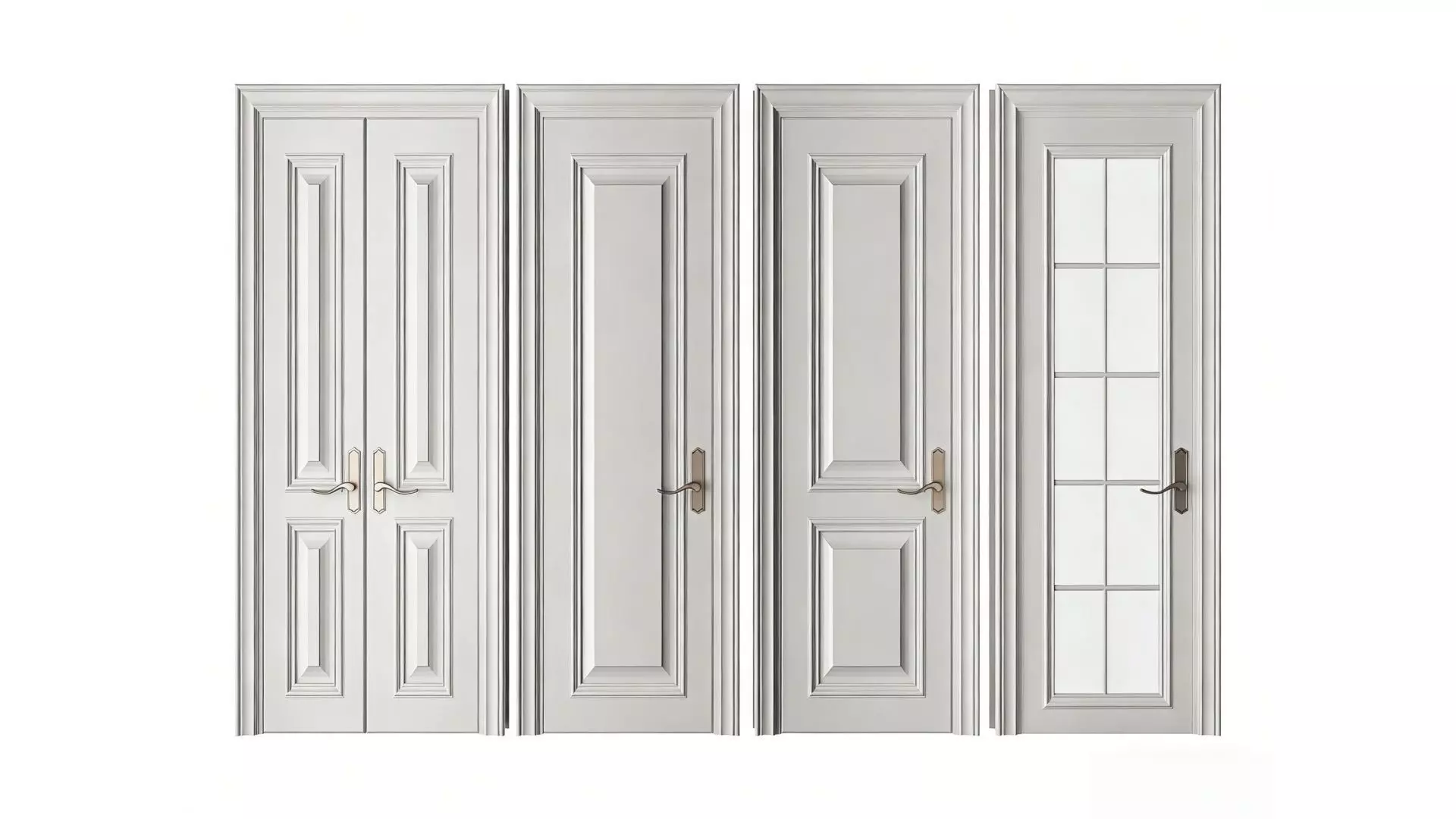 This is a collection of interior doors in a modern minimalist style. With a soft light gray as the base, the surface is finished with an exquisite baking paint process, presenting a high-end matte texture. The collection includes four styles: double swing doors, single flat-panel doors, embossed textured doors, and glass lattice doors. The metallic handles enhance the overall light luxury vibe.Double Swing Doors: Featuring a symmetrical embossed line design, they are suitable as entrance doors or master bedroom doors, exuding a grand and stable aura.Flat-panel Doors: Adorned with simple vertical lines, they visually elongate the floor height and are compatible with multiple styles such as minimalism and Nordic style.Embossed Textured Doors: Boasting a classic top-bottom symmetrical shape with an inherent retro charm, they are ideal for French and American-style interiors.Glass Lattice Doors: Composed of 12 pieces of transparent glass panels, they allow light transmission while ensuring privacy. They are the perfect choice for kitchens, bathrooms, and studies.