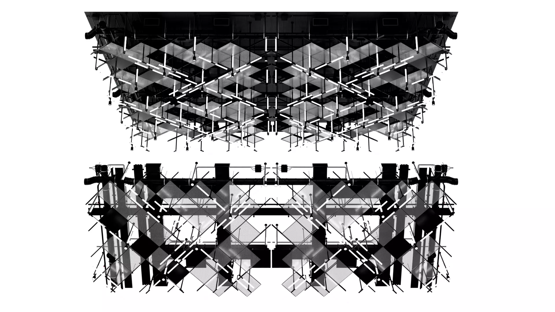 This ceiling lighting system combines industrial metal structures with contemporary parametric geometry, perfect for architectural visualization, event design, stage setups, and modern interior scenes.