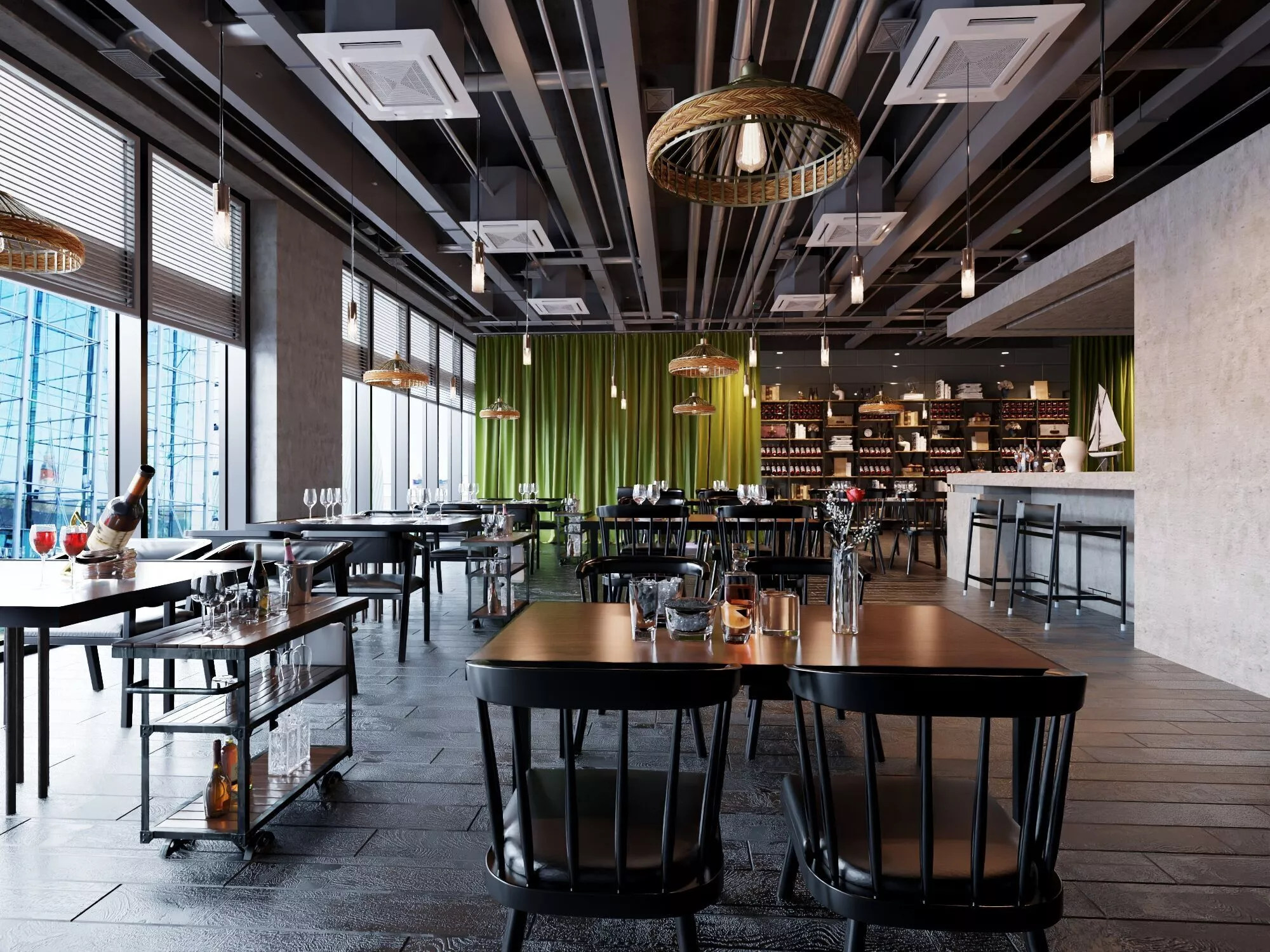 Professional high-quality 3D complete scene of an Industrial Loft Restaurant meticulously crafted for premium hospitality visualization and architectural projects. This comprehensive asset features a sophisticated dining environment including elegant dark wood tables ergonomic bistro chairs a fully stocked wine display wall mobile serving carts and a modern exposed ceiling with intricate HVAC piping and decorative woven pendant lights.