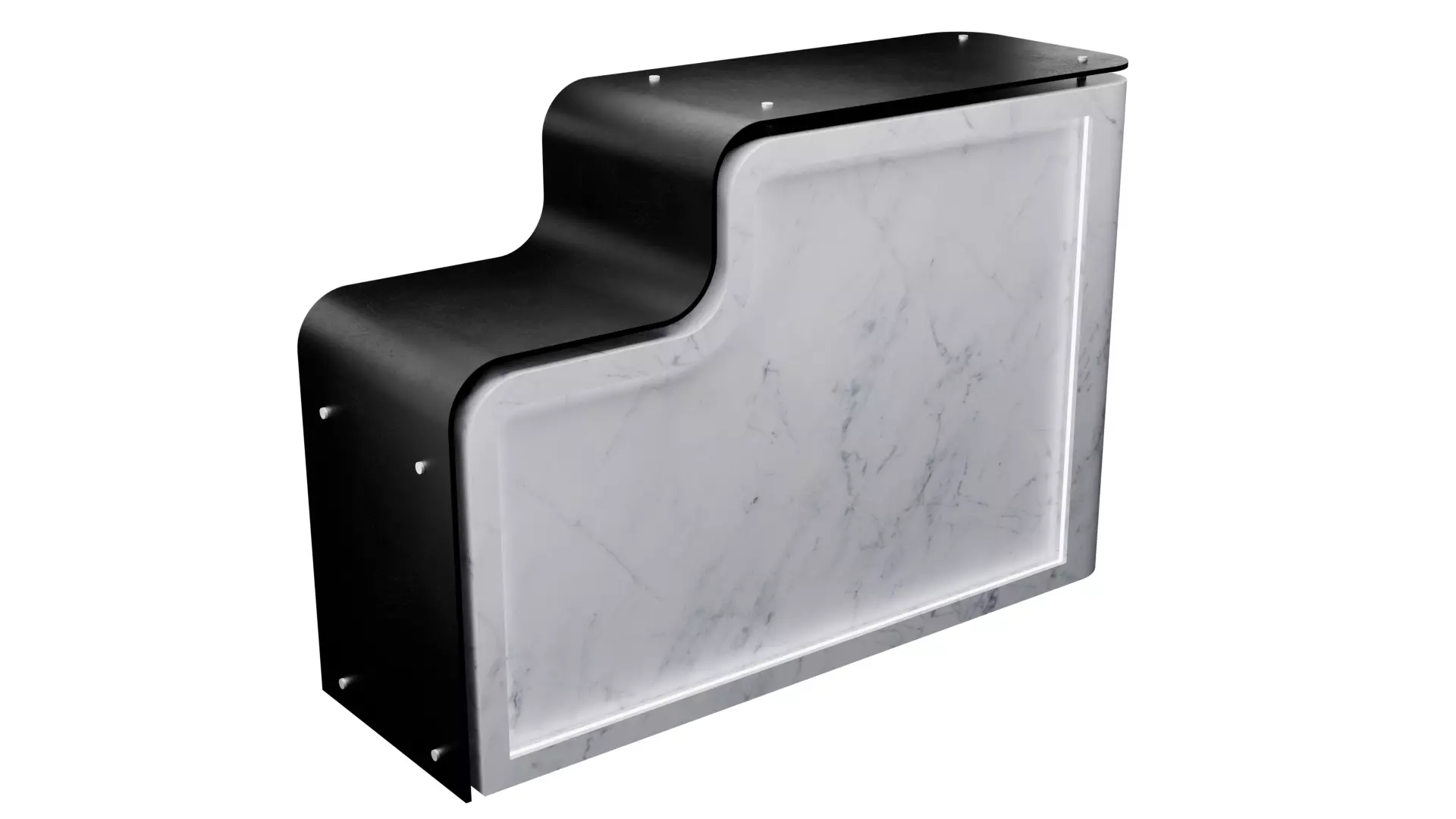 Info or display counter. Main body is marble laminate, on the front there is a niche with led light around. From the back inside part is wooden laminate with cabinets and shelves inside. As a tabletop we used metal plate shaped to suit the body, mounted on 25mm distance.