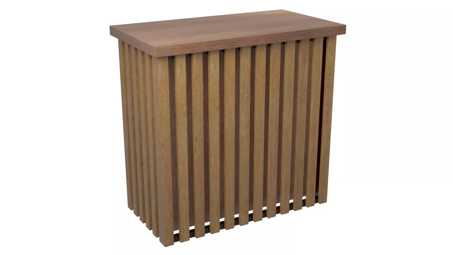 Info or display counter with Black painted steel construction covered with wooden planks and thick wooden top.On the back side there is cabinet with open space (20cm high) and wooden door underneath.