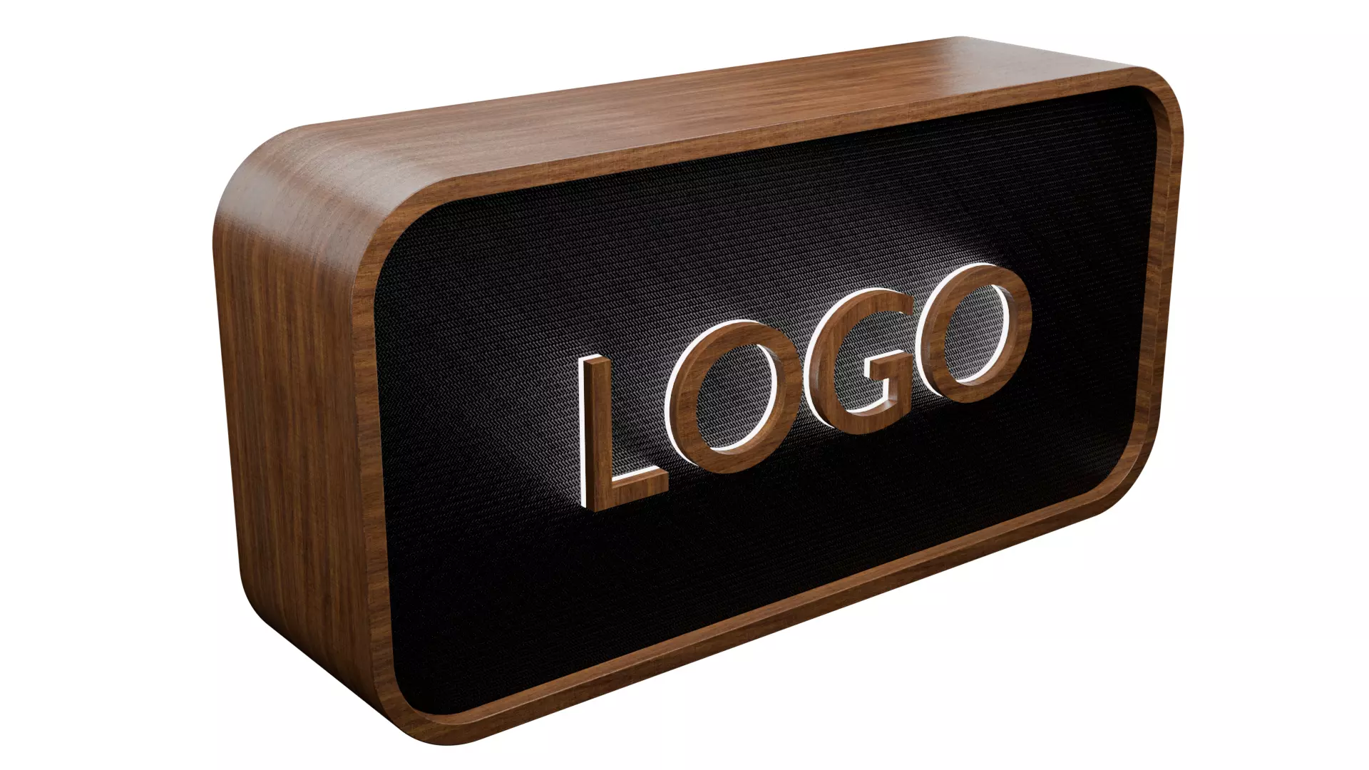 Info or display counter. Main body is wooden laminate, on the front there is a niche with carbon fiber surface and 3d light logo with halo effect. From the back inside part is wooden laminate with cabinets and shelves inside.
