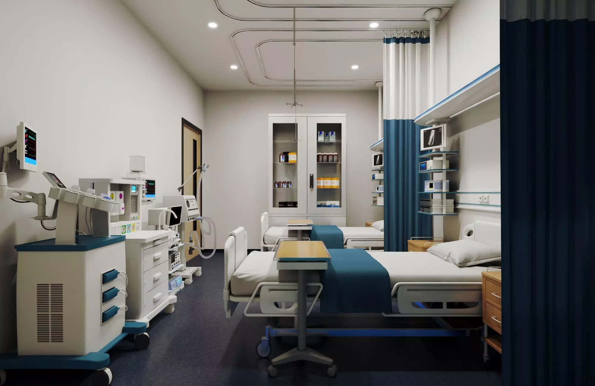 This immersive 3D model depicts a modern intensive care unit (ICU) hospital room, complete with an adjustable patient bed featuring blue bedding, an overbed tray table, a mechanical ventilator with attached tubing and monitoring dials, privacy curtains on ceiling tracks, built-in wall cabinets and shelves stocked with medical supplies, and blue-accented doors leading to a hallway with additional rooms. The design includes functional elements like recessed lighting, medical gas outlets, and a clean, sterile environment with dark blue flooring and neutral walls for a realistic healthcare setting. Ideal for medical training simulations, architectural visualizations, virtual reality hospital tours, or game development. Optimized with high-quality textures for equipment, fabrics, metals, and surfaces. File formats: OBJ, FBX, Blender.