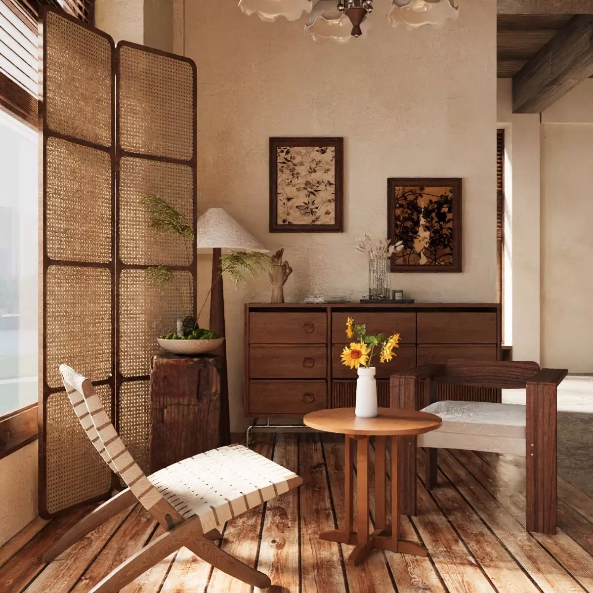 This space fully demonstrates the simplicity and naturalness of Japanese Wabi-Sabi aesthetics. With wood color as the main tone, matched with vintage furniture and soft decorations, it creates a quiet, healing and timeless leisure area, like a spiritual home where people can instantly let go of fatigue.A large number of natural solid wood is used for the floor and furniture. The texture of the wood grain and the vintage color convey the Wabi-Sabi pursuit of the beauty of imperfection. The use of rattan screens and woven leisure chairs not only echoes natural elements, but also strengthens the simple atmosphere of the space through handcrafted details. The soft decoration is very ingenious. The sunflower bouquet on the log table adds vitality, and the retro floor lamp and decorative paintings with plant patterns all highlight the elegant taste of Japanese life in simplicity.