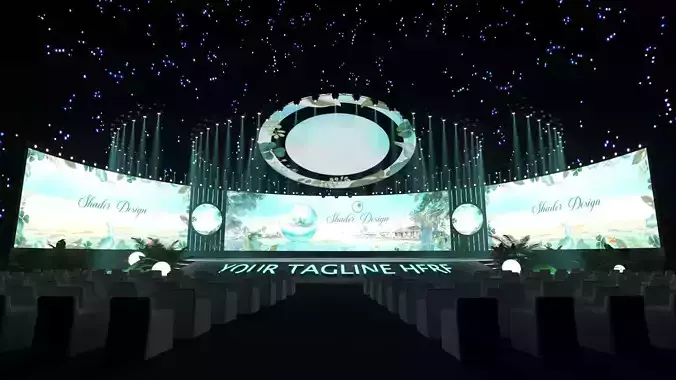 The LED Panoramic Conference Event Stage is a high-quality, render-ready 3D model designed for both outdoor and indoor luxury events with a fresh tropical theme. Inspired by lush gardens, pure crystal-clear dewdrops, and a magical starlit sky, this stage is ideal for real estate project launch ceremonies and brand activation events.