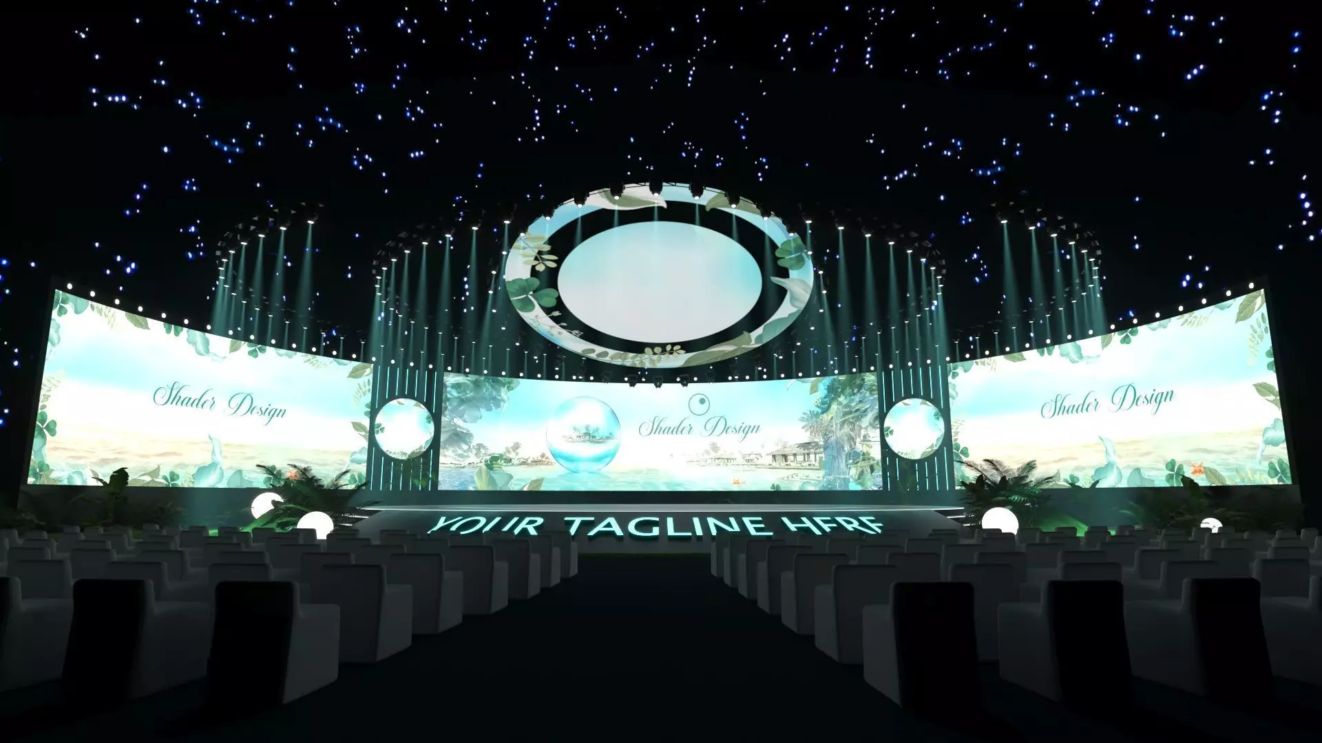 Design Concept – Tropical LuxuryThe stage combines a curved multi-tiered LED platform with glowing neon trim edges, three oversized rounded LED display panels showcasing tropical greenery visuals, and a wide panoramic center backdrop depicting a resort-style landscape. Elegant glowing sphere floor lamps and lush tropical plants complete the atmosphere — creating an immersive event experience that feels both premium and inspired by the pure dewdrops of nature.This design language speaks directly to real estate developers launching resort villas, eco-townships, tropical condominiums, or beachside properties — where the stage itself becomes part of the brand story. Above, an oval LED ring suspended mid-air adorned with tropical leaf motifs, reflecting light down onto the stage to create a magical sense of depth. Stage lights cascade from the ceiling like rays of sunlight piercing through a forest canopy, blending seamlessly with the starlit night sky above — delivering an event space that is both grand and refined, the very definition of elegance.