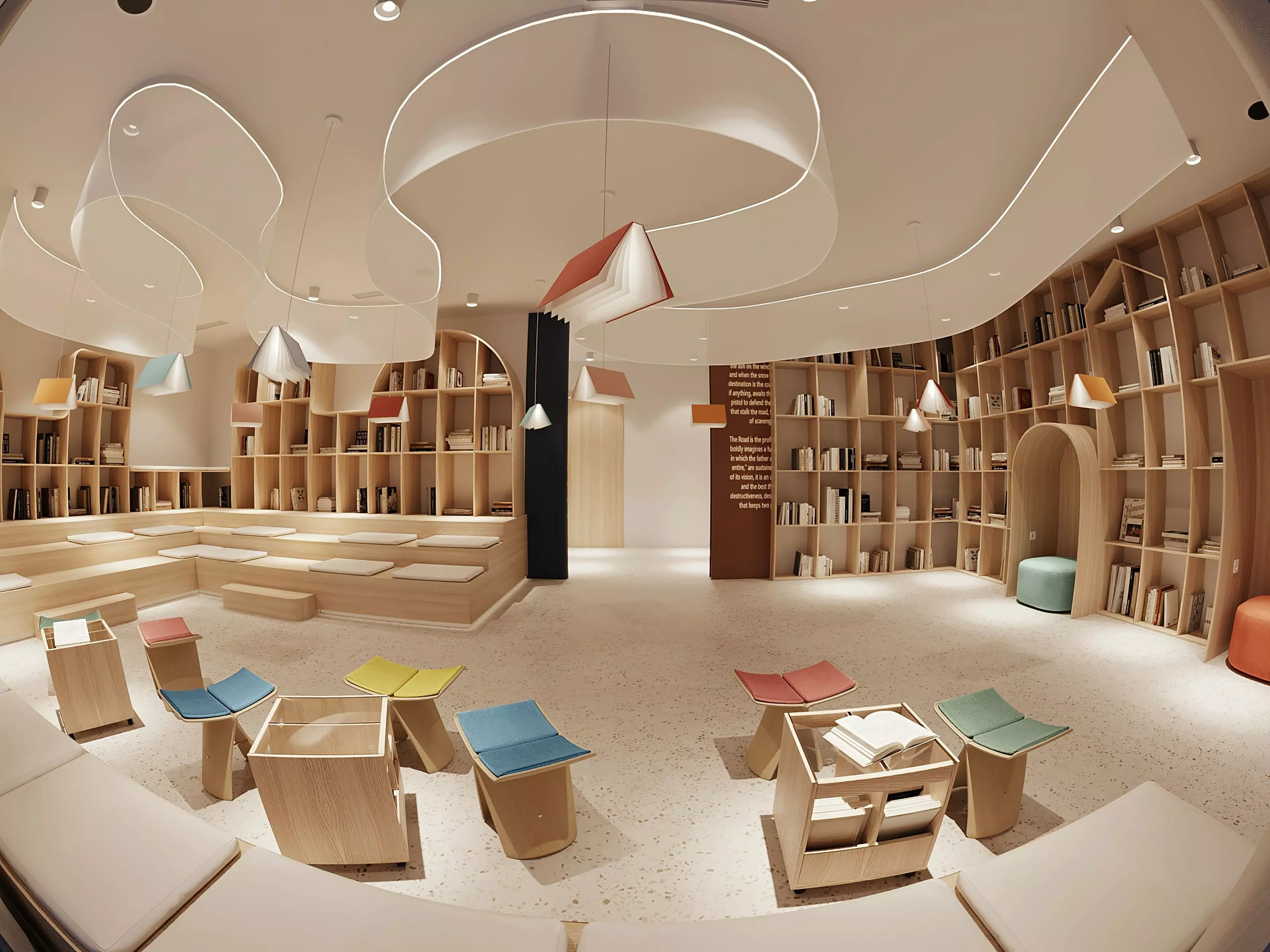 A high-quality, conceptual 3D scene of a modern library or creative hub, designed with a focus on fluid forms and a warm minimalist aesthetic. This scene features a unique flowing ceiling installation with integrated lighting, custom-designed wooden bookshelves, and a versatile tiered seating area.
