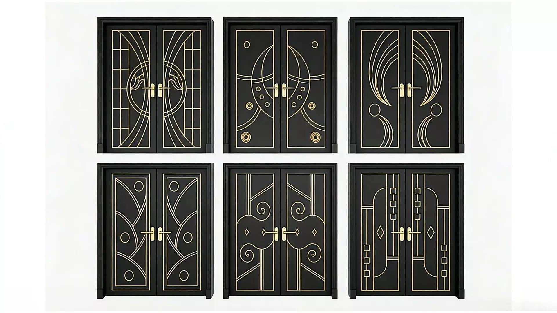 This set of images showcases six modern luxury double-door designs, featuring a classic black-and-gold color scheme. The golden lines on the door panels outline highly decorative geometric patterns and fluid curves, seamlessly blending the symmetrical aesthetics of Art Deco with the crispness of modern minimalism.Each door boasts a unique and meticulously crafted pattern: some use flowing arc lines to create a sense of dynamism, others employ orderly geometric squares and circles to build a sense of order, and still others incorporate swirling motifs to add a touch of retro charm. These doors are not just entrances to a space, but also like pieces of wall art. They are ideal for villas, high-end apartments, or commercial spaces that pursue a unique design aesthetic, instantly elevating the sophistication and style of the entire space.